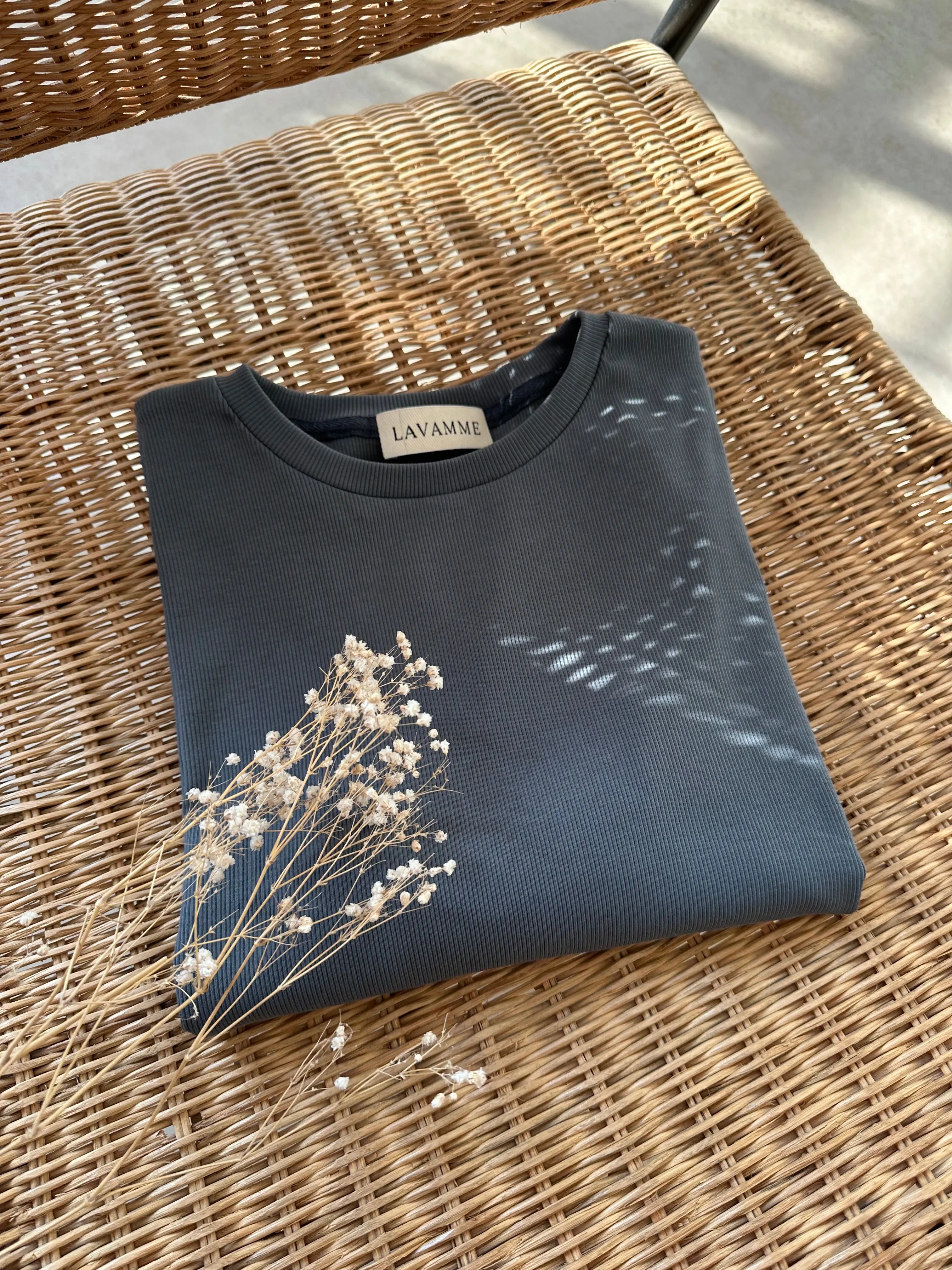 T-shirt w eleganckim odcieniu intensywnej szarości, który idealnie łączy styl i komfort. Wykonany z wysokiej jakości prążkowanej bawełny, która jest niezwykle przyjemna dla skóry. Klasyczny, luźny krój i kolor sprawiają, że T-shirt doskonale pasuje do wielu stylizacji – zarówno casualowej, jak i bardziej eleganckiej. Będzie świetnym uzupełnieniem szafy kapsułowej.