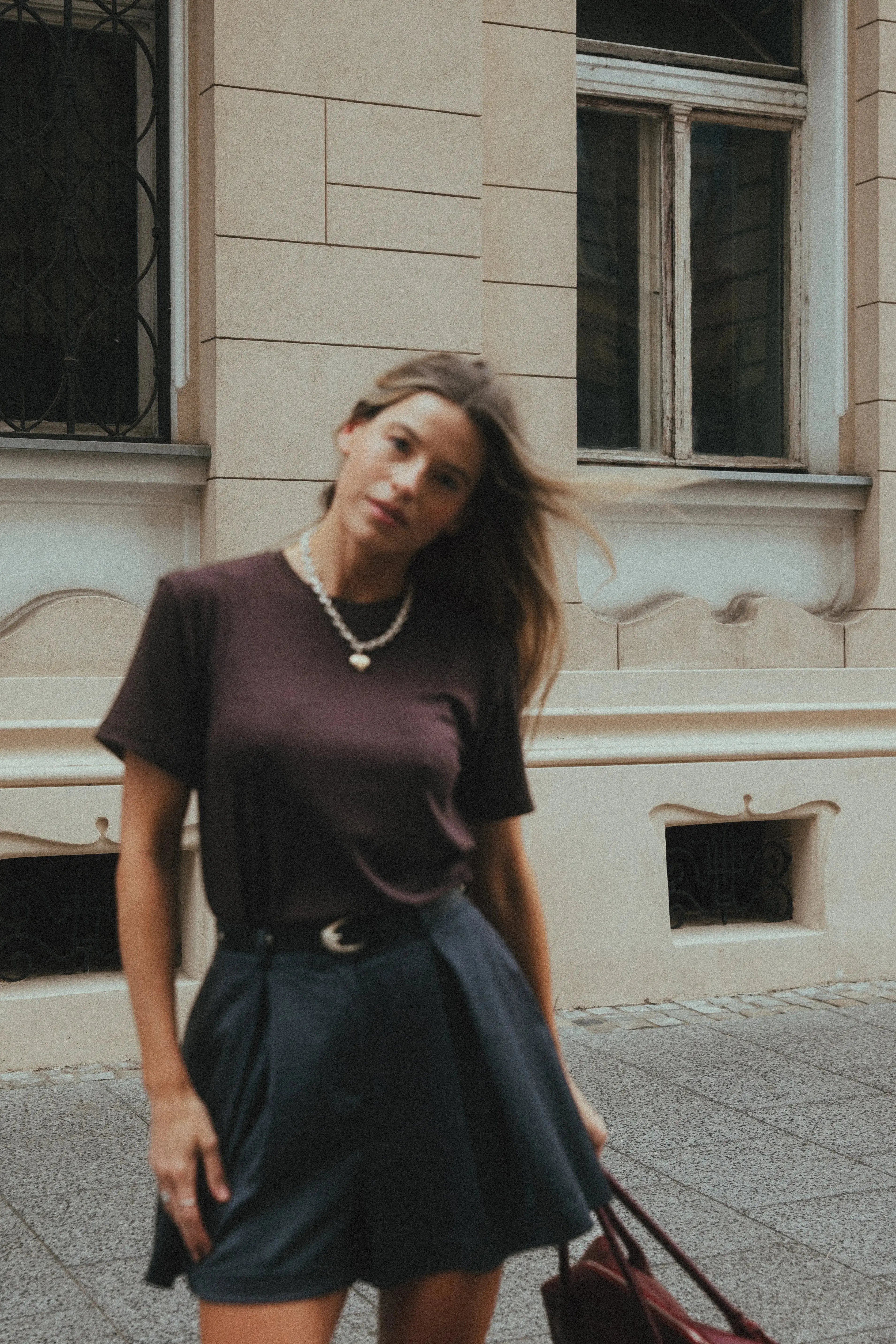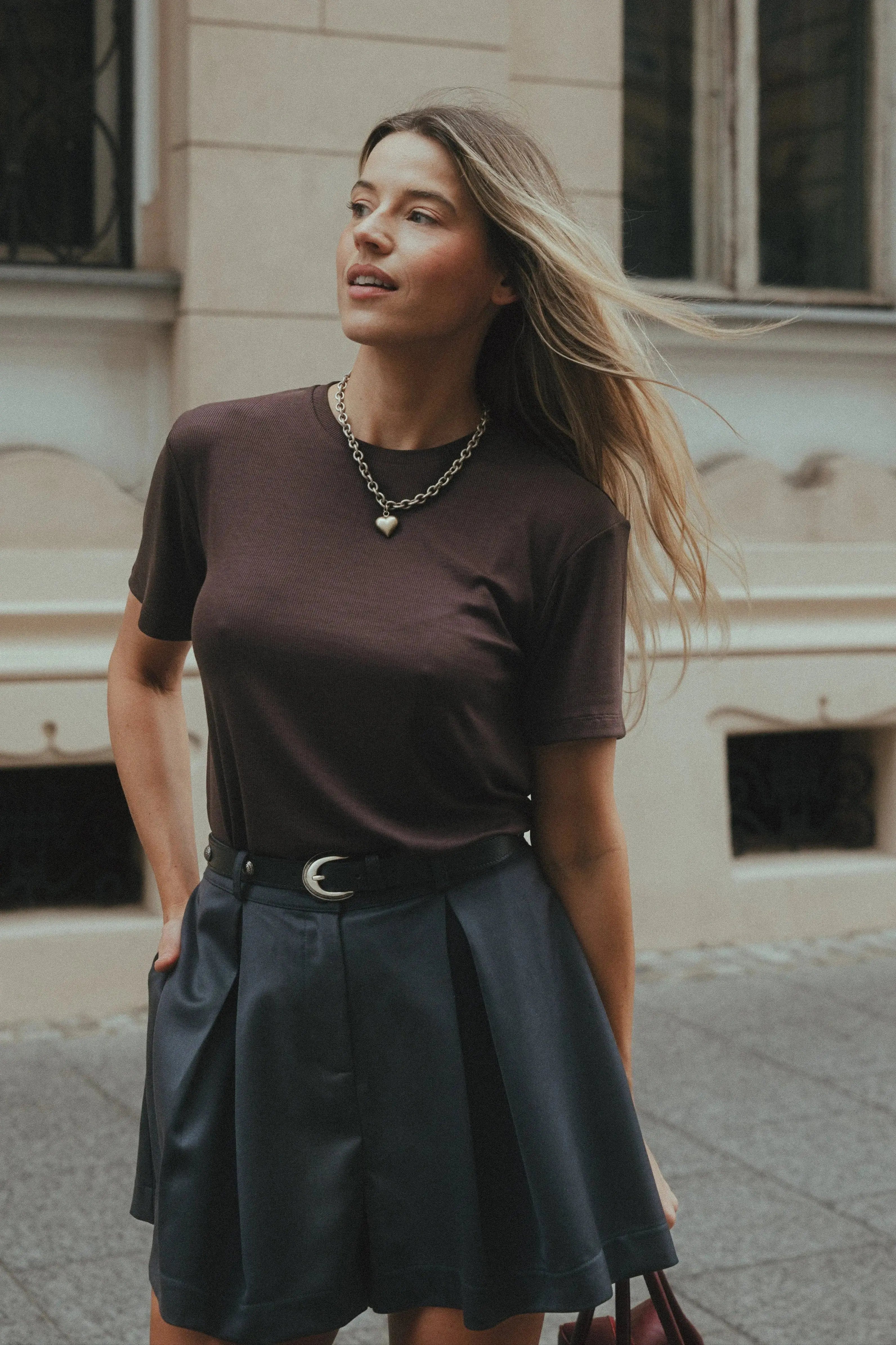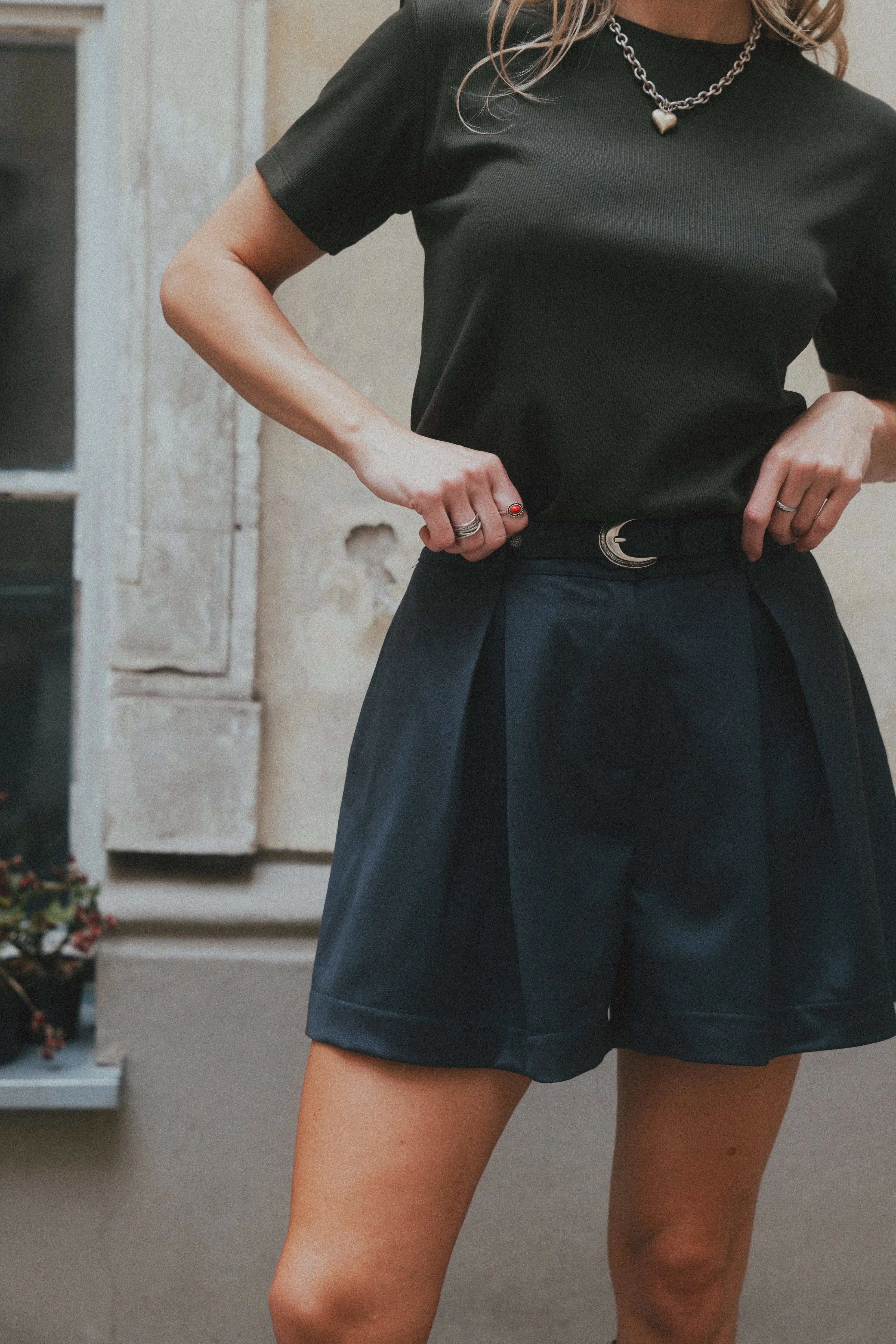 Charakterystyczna kontrafałda z przodu nadaje im unikalnego charakteru, dodając lekkości i nowoczesnej formy. Klasyczny krój w połączeniu z delikatnym połyskiem wełny sprawia, że szorty świetnie komponują się zarówno z elegancką koszulą, jak i prostym t-shirtem.