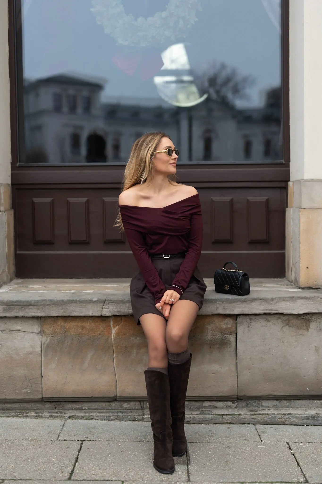 Przekładany longsleeve z odkrytymi ramionami w kolorze dojrzałej wiśni