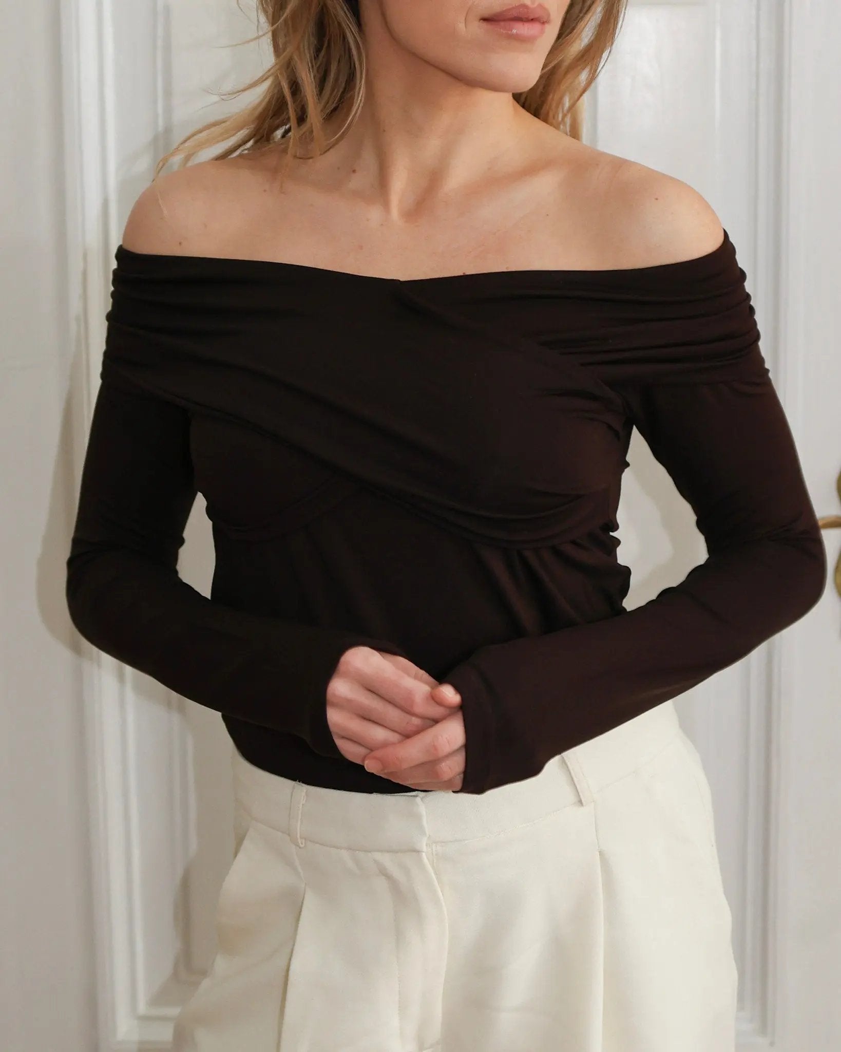 Przekładany longsleeve z odkrytymi ramionami w kolorze głębokiej czekolady
