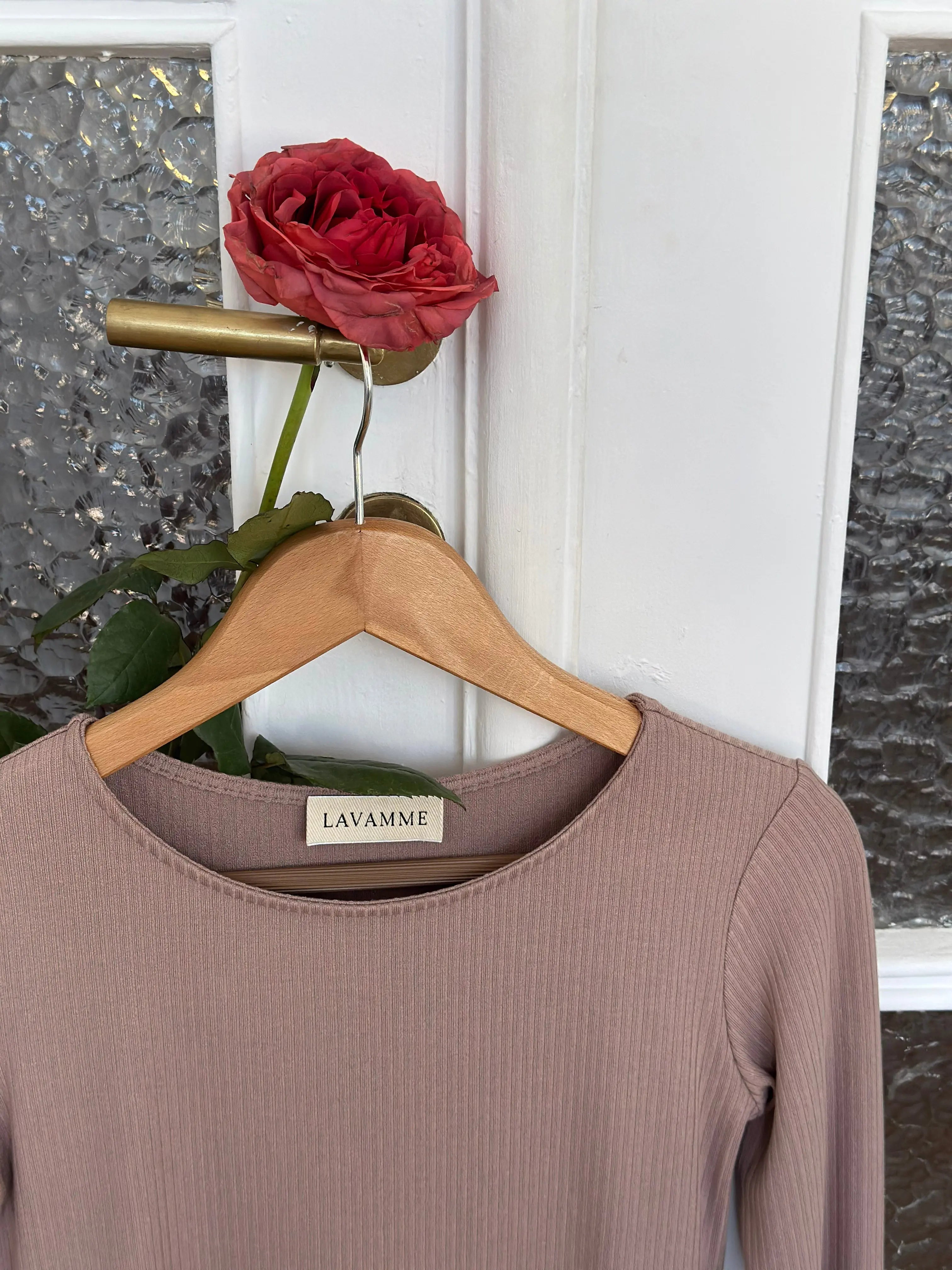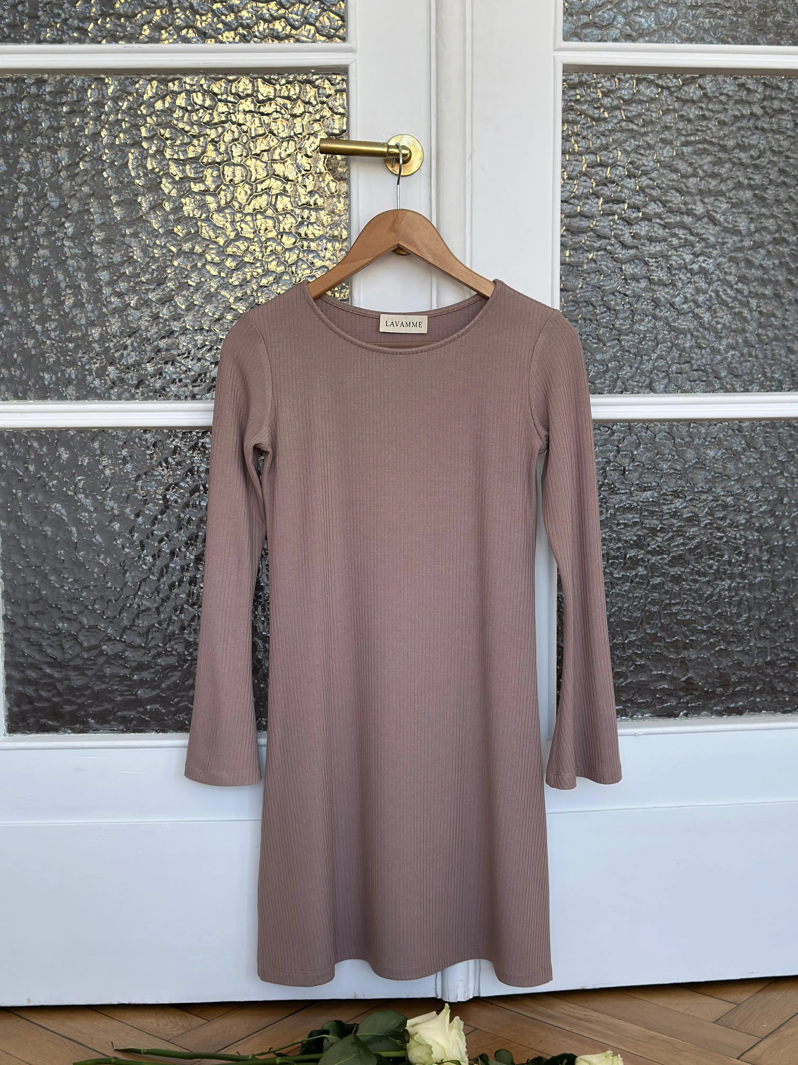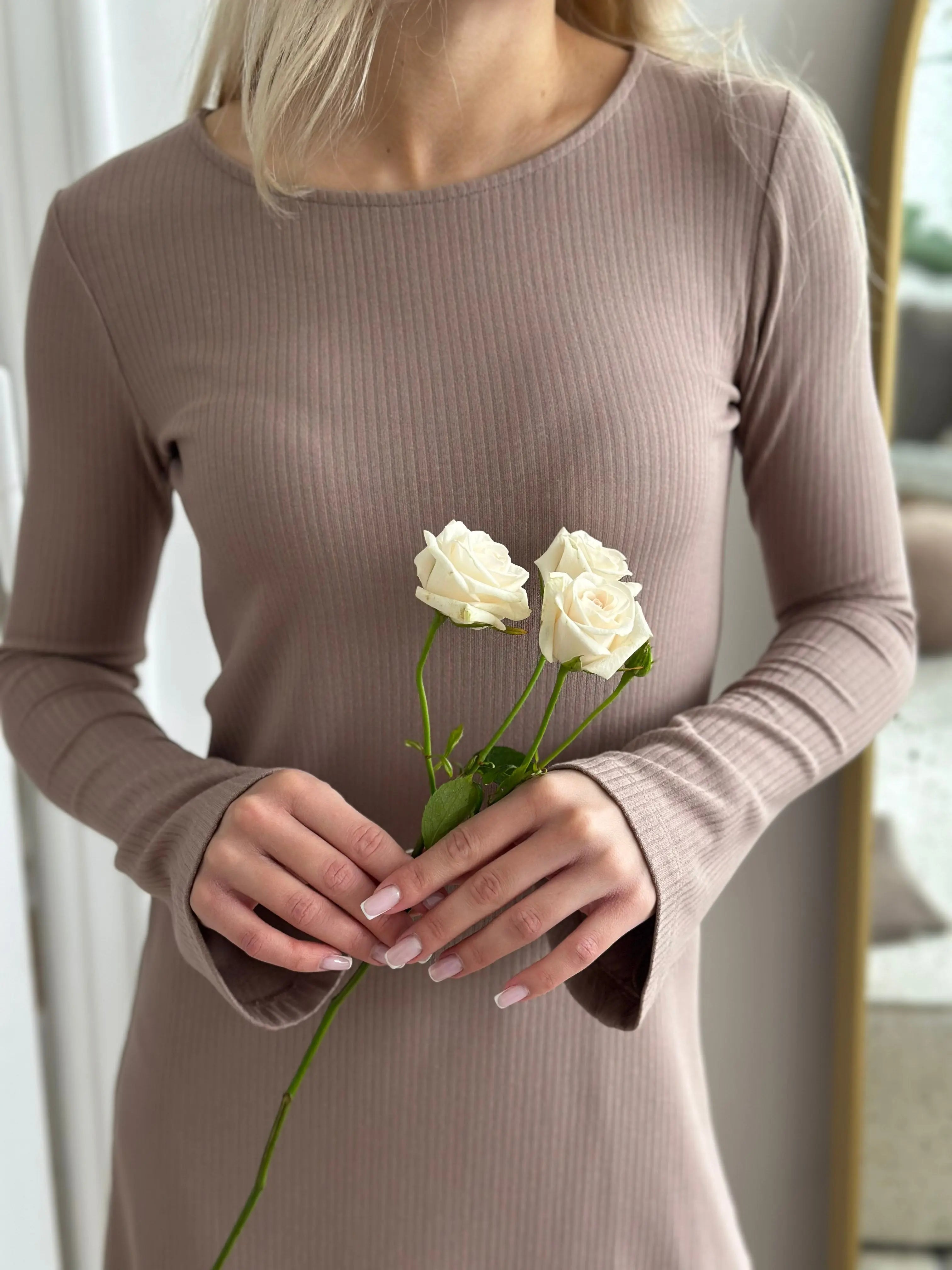Ponadczasowa sukienka w ciepłym, kremowo-kawowym odcieniu, który przywołuje na myśl spokojne poranki z filiżanką ulubionej kawy. Jej lekko rozkloszowany krój w kształcie litery A otula sylwetkę z lekkością i swobodą, a delikatnie rozszerzane rękawy pięknie poruszają się z każdym ruchem. Uszyta z miękkiej, prążkowanej dzianiny, zapewnia komfort noszenia przez cały dzień – niezależnie od okazji.