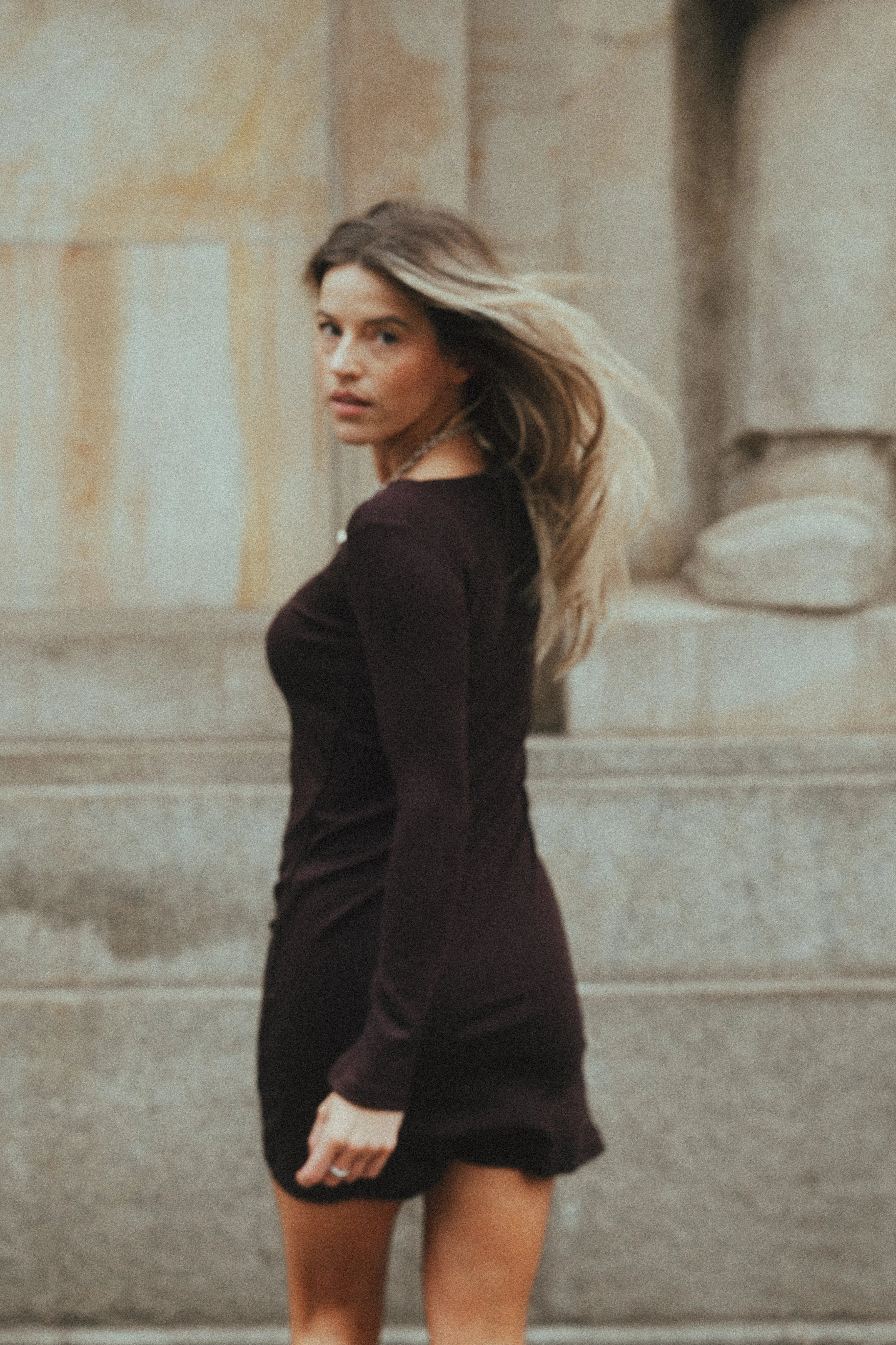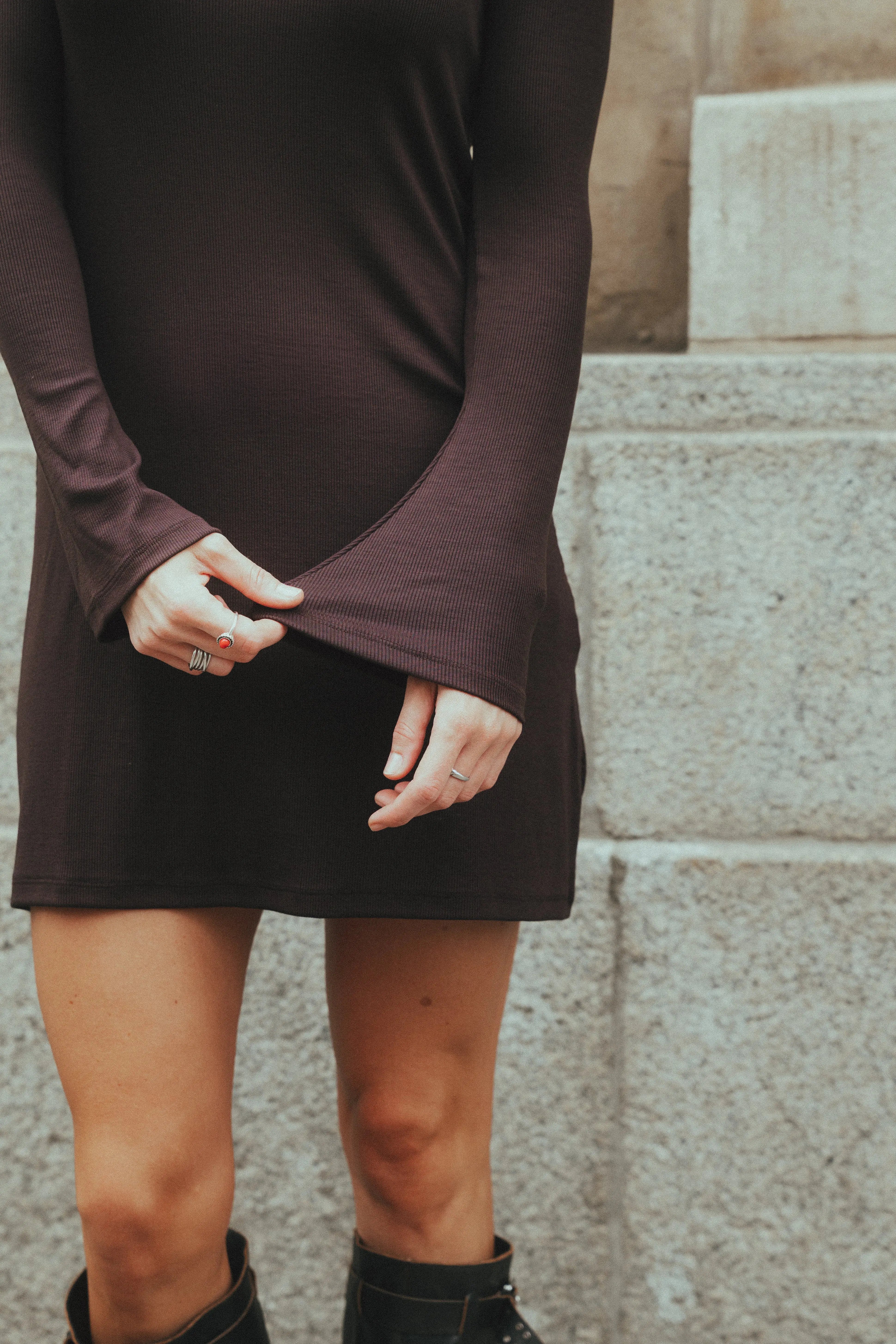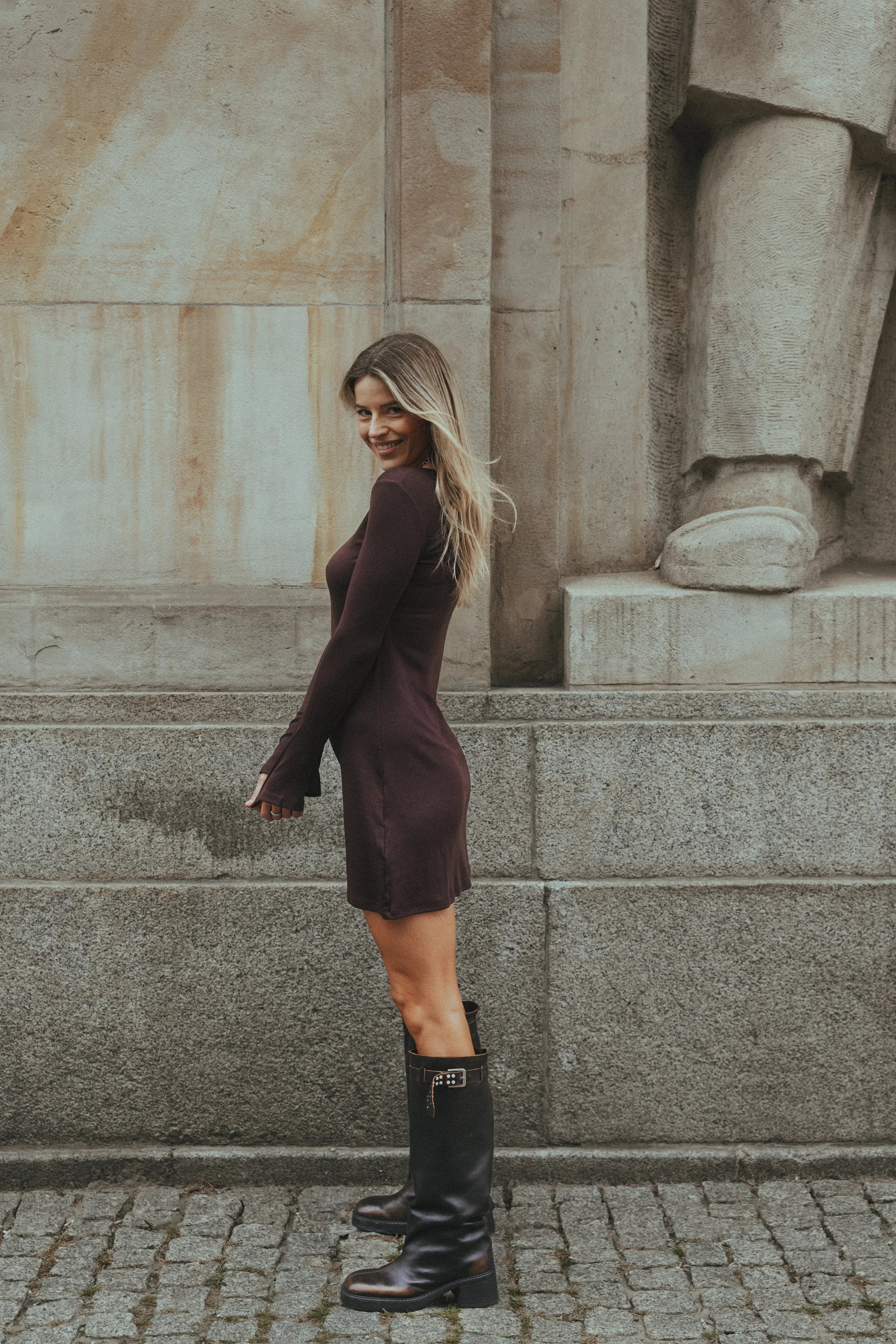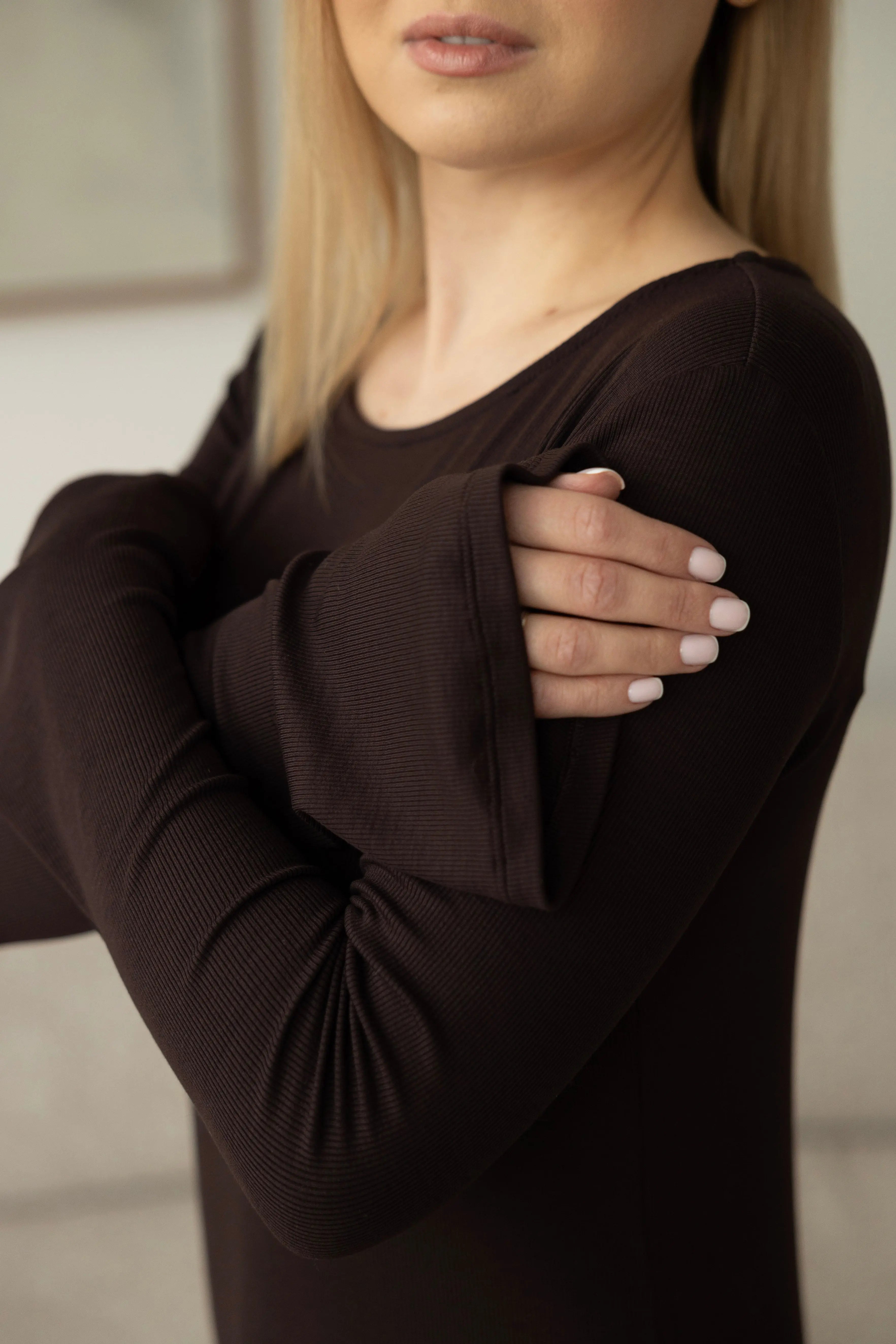 Wykonana z miękkiej, prążkowanej dzianiny Lenzing Lyocell, jest nie tylko przyjemna dla skóry, ale też idealnie sprawdzi się w warstwowych stylizacjach. W chłodniejsze dni noś ją z wysokimi kozakami i płaszczem, zestawiaj z grubym swetrem narzuconym na ramiona albo z klasycznym trenczem. Z botkami i rajstopami w odcieniach ziemi stworzy minimalistyczny, a zarazem przytulny look.