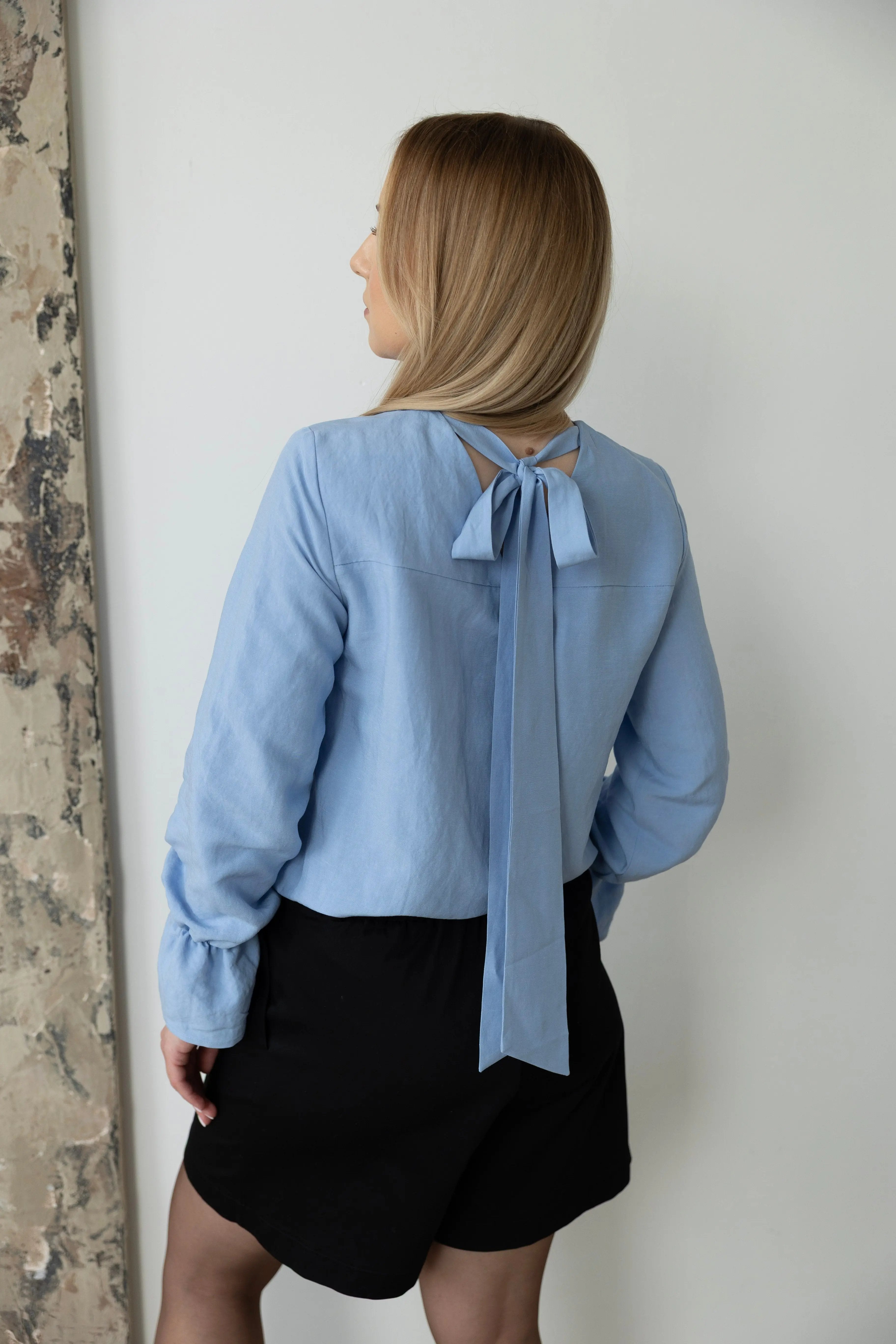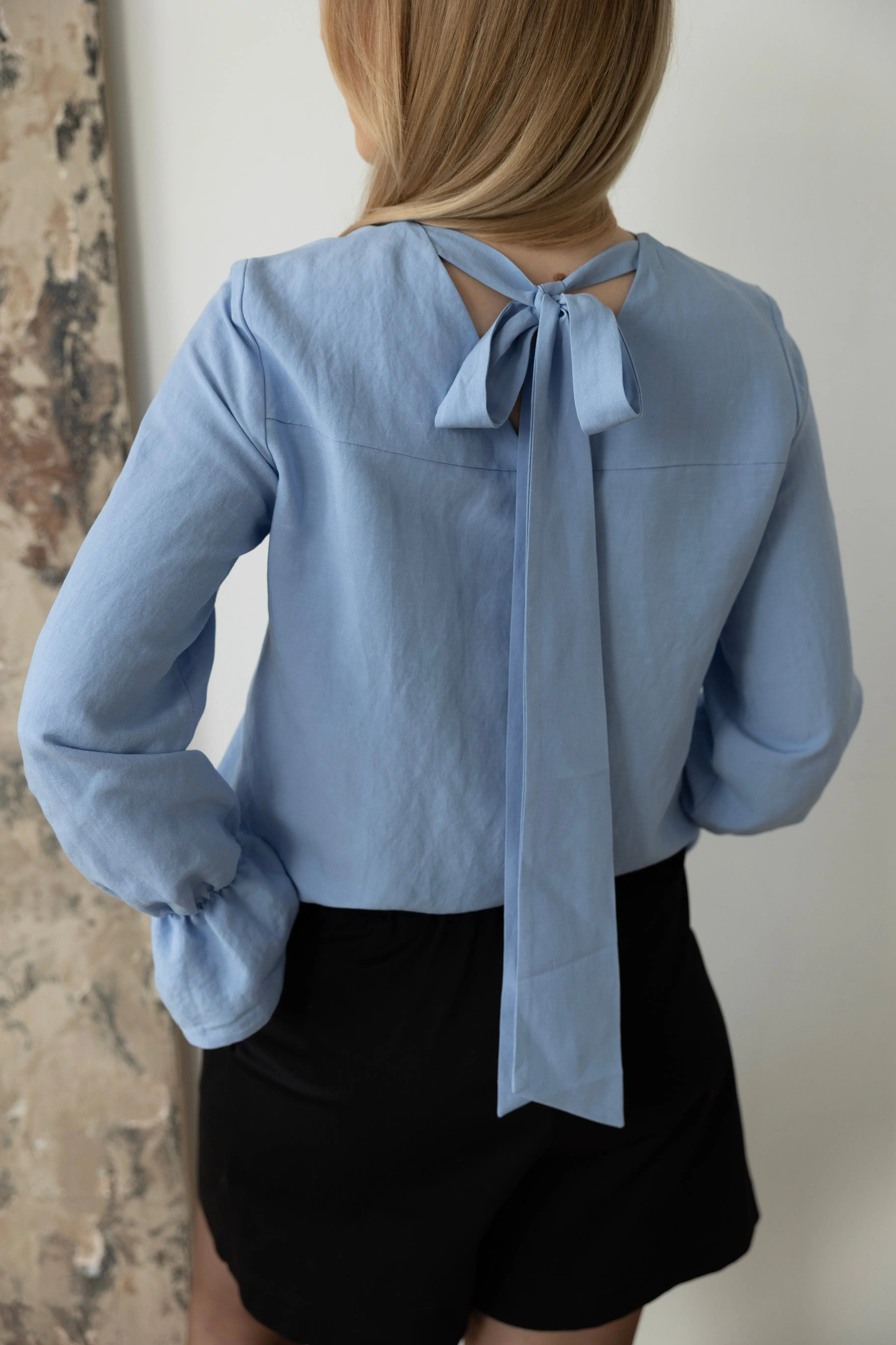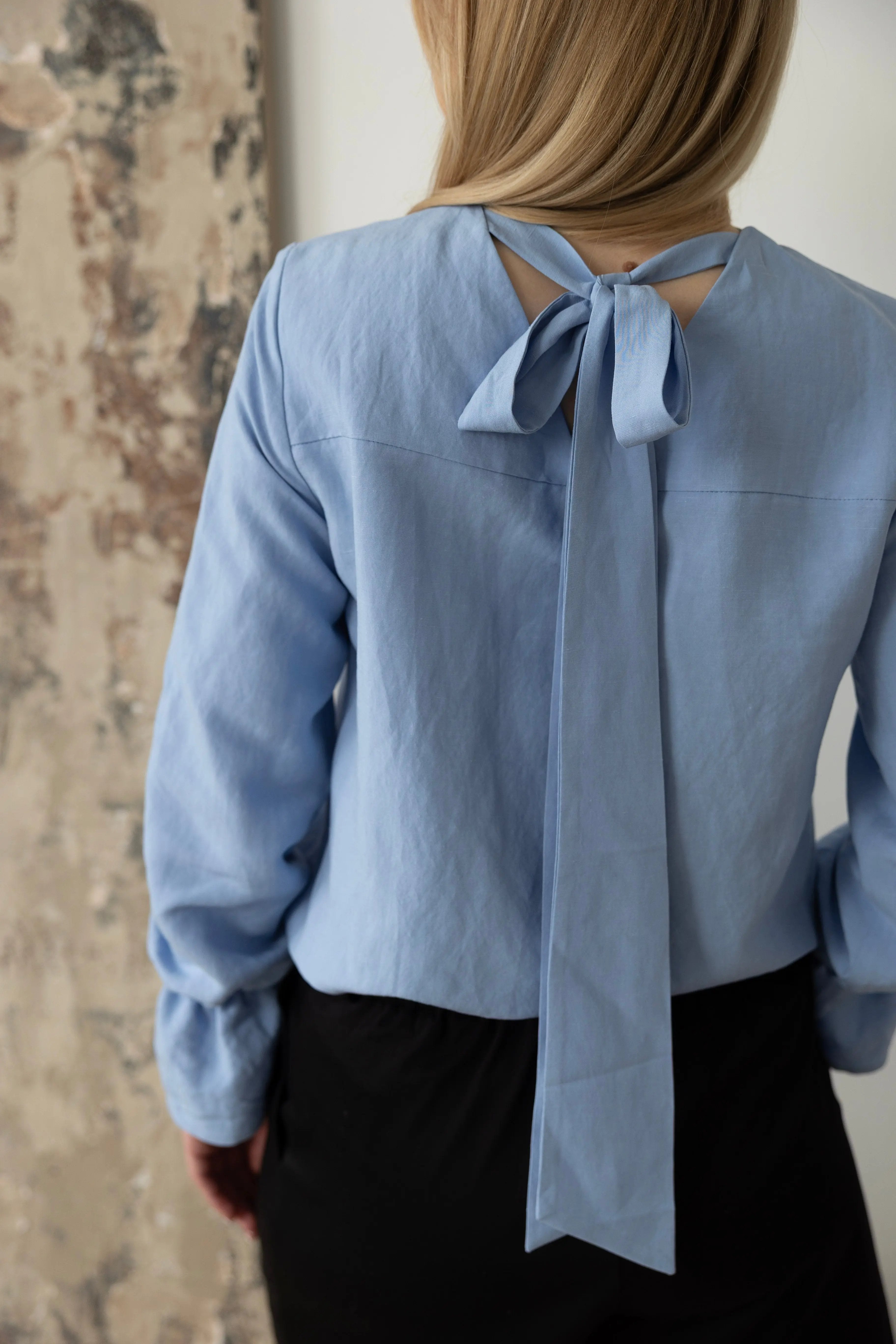 • Detal: Bluzka posiada długą, wąską szarfę wszytą przy dekolcie, którą można zawiązać w kokardę z przodu lub z tyłu, nonszalancko puścić luźno lub owinąć wokół szyi – w zależności od nastroju i okazji.