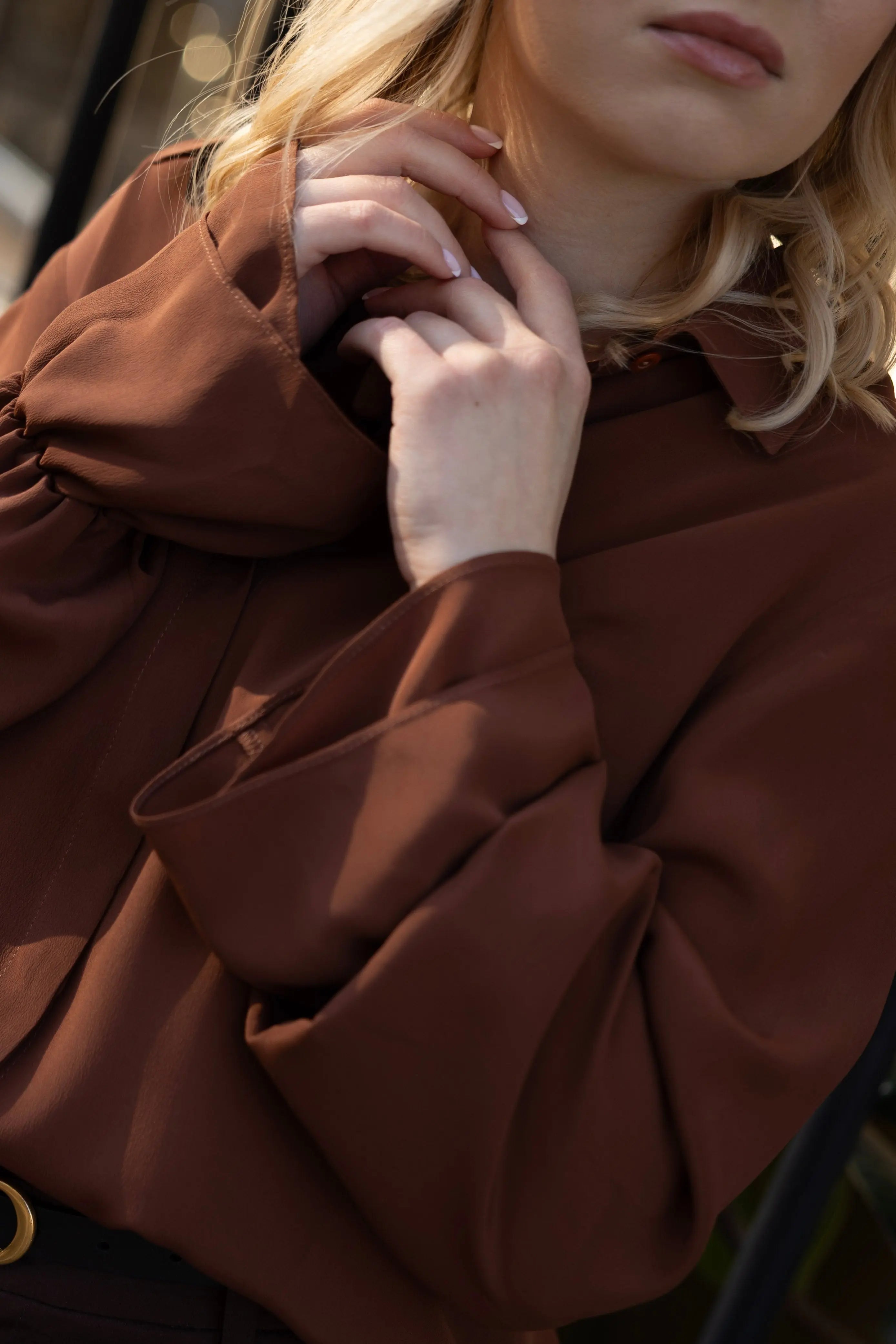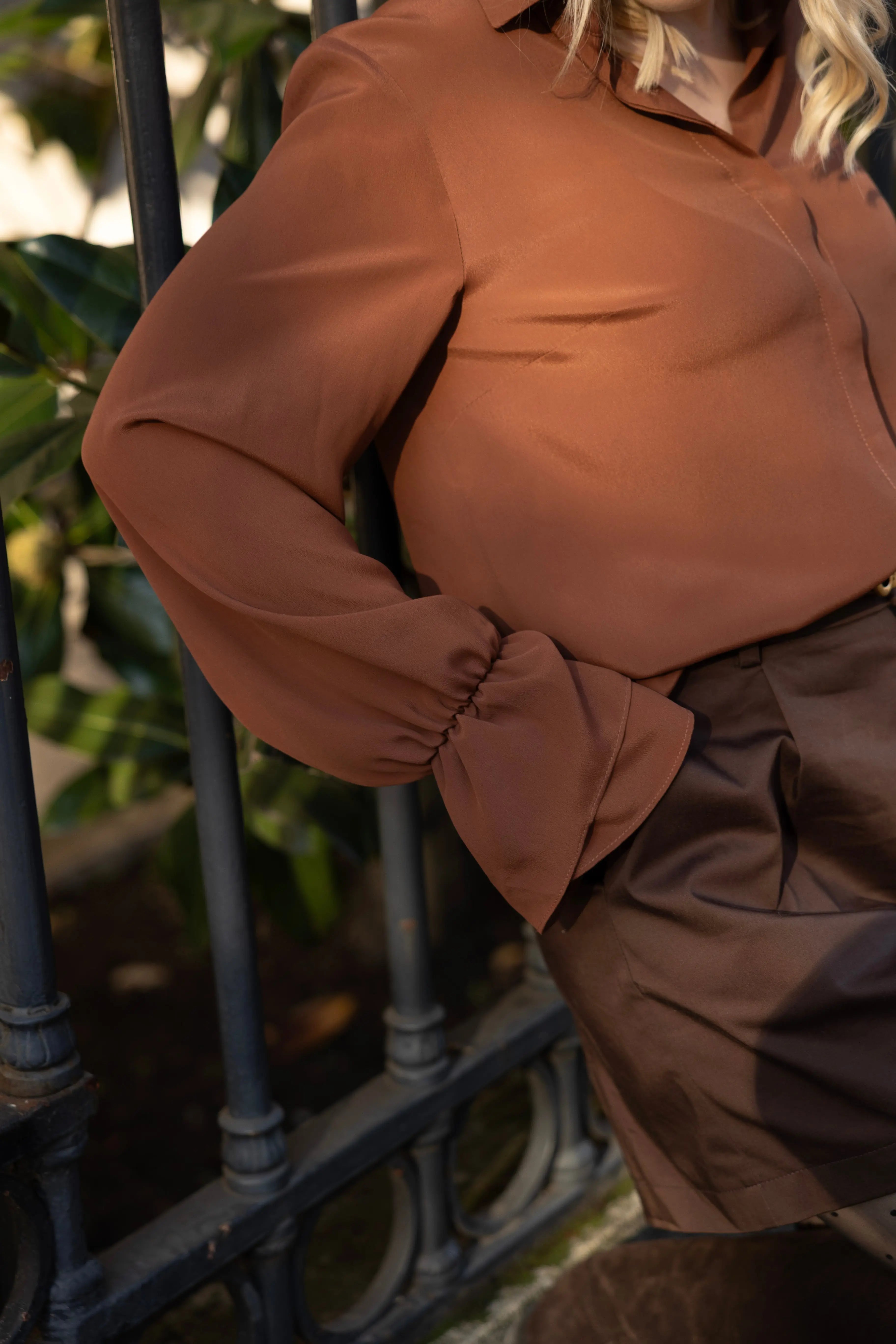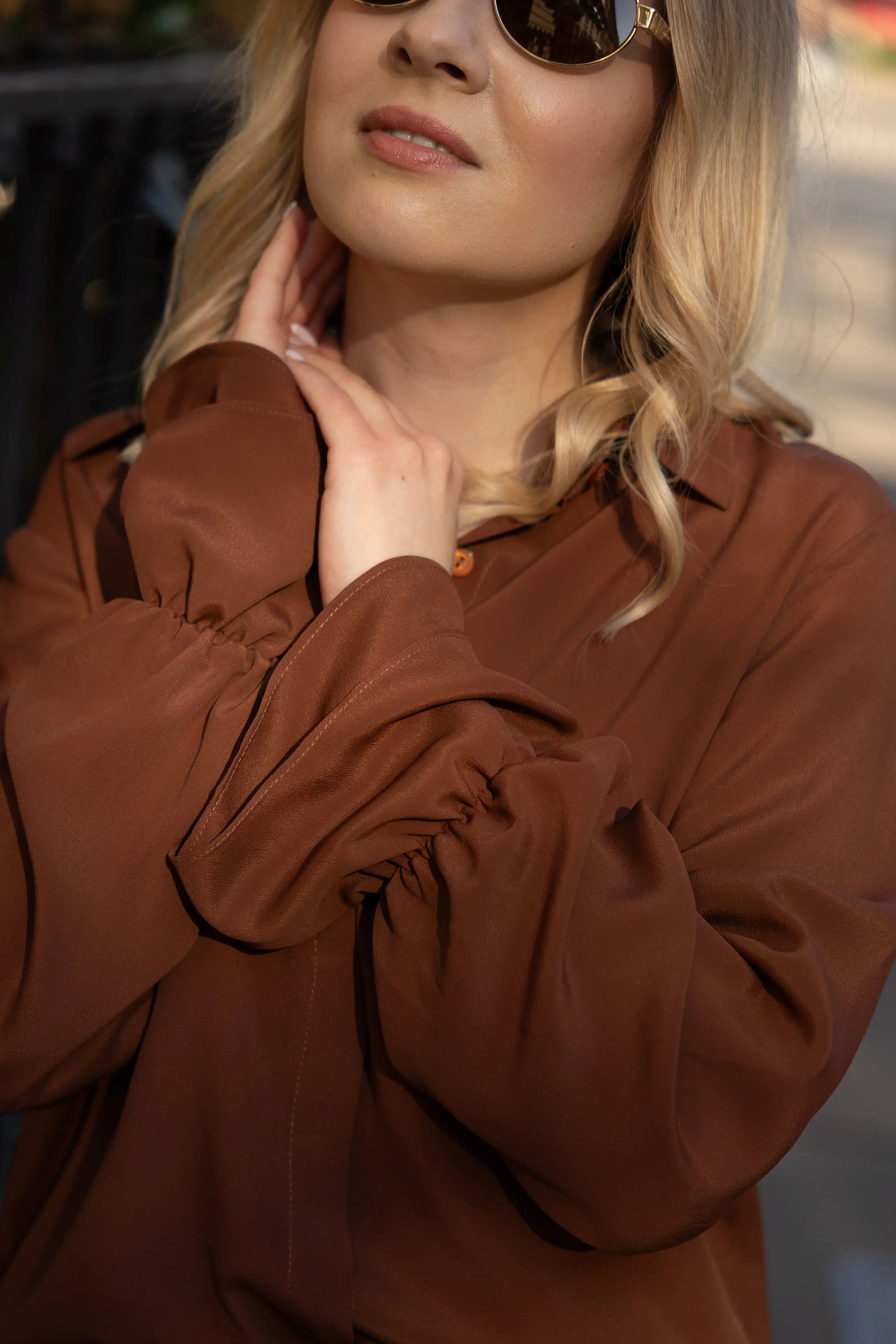 Koszula No. 3 Marron Brûlé to perfekcyjne połączenie luksusowych materiałów, francuskiej nonszalancji i ponadczasowego minimalizmu – dla kobiet, które cenią jakość i wyrafinowany styl.