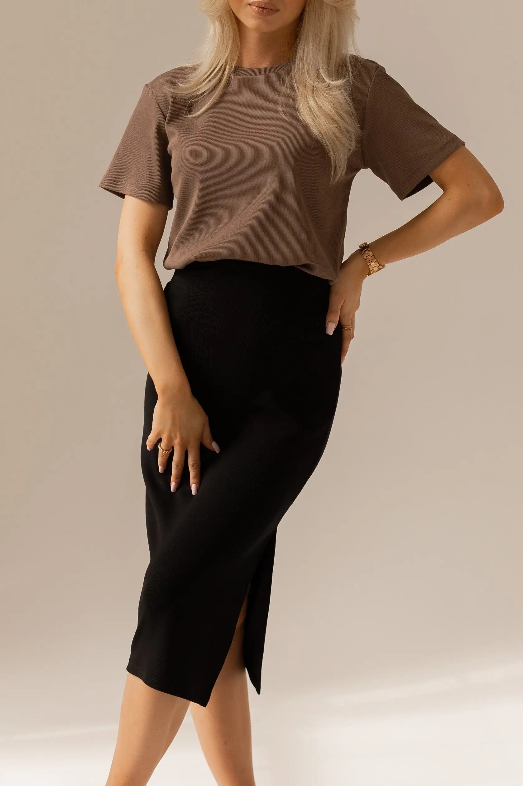 Spódnica do wystylizowania na wiele sposobów w kolorze klasycznej czerni, która idealnie łączy styl i komfort. Wykonana jest z wysokiej jakości prążkowanej dzianiny, która jest niezwykle przyjemna dla skóry. Klasycznym krój i kolor sprawiają, że spódnica doskonale pasuje do wielu stylizacji – zarówno casualowej, jak i bardziej eleganckiej. Będzie świetnym uzupełnieniem szafy kapsułowej.