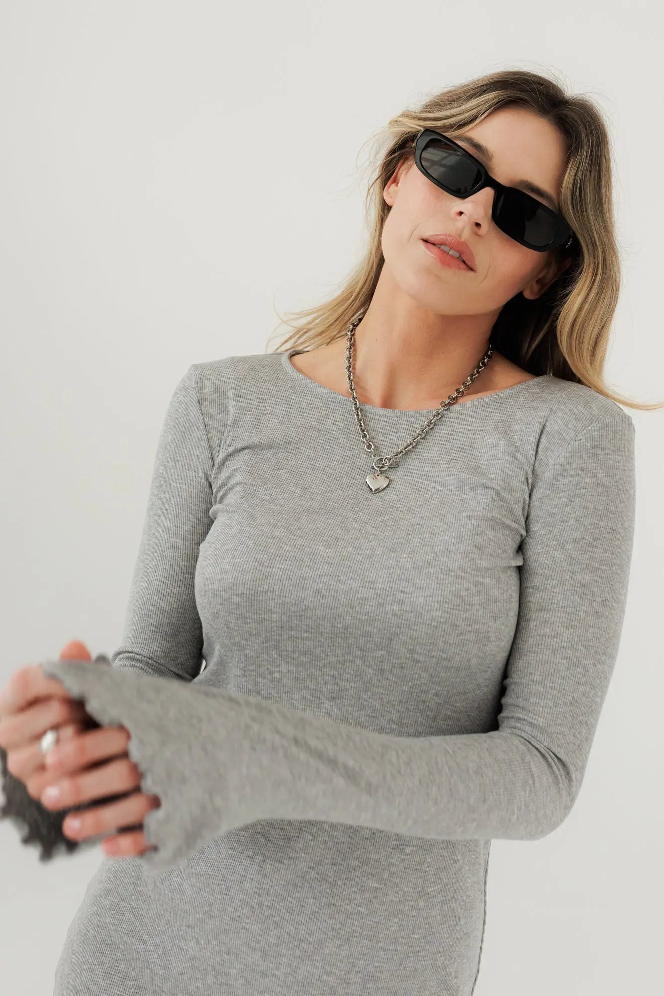 Wyjątkowa sukienka w subtelnym, jasnoszarym odcieniu wykończona uroczą mereżką, która łączy elegancję i minimalizm z codziennym komfortem. Jej lekko rozkloszowany fason w kształcie litery A nadaje sylwetce swobody i lekkości, a rozkloszowane rękawy harmonijnie podkreślają każdy ruch. Wykonana z miękkiej, prążkowanej dzianiny Lenzing Lyocell w odcieniu Gris Clair Dentelle, otula ciało delikatnością inspirowaną prowansalskim niebem o poranku.