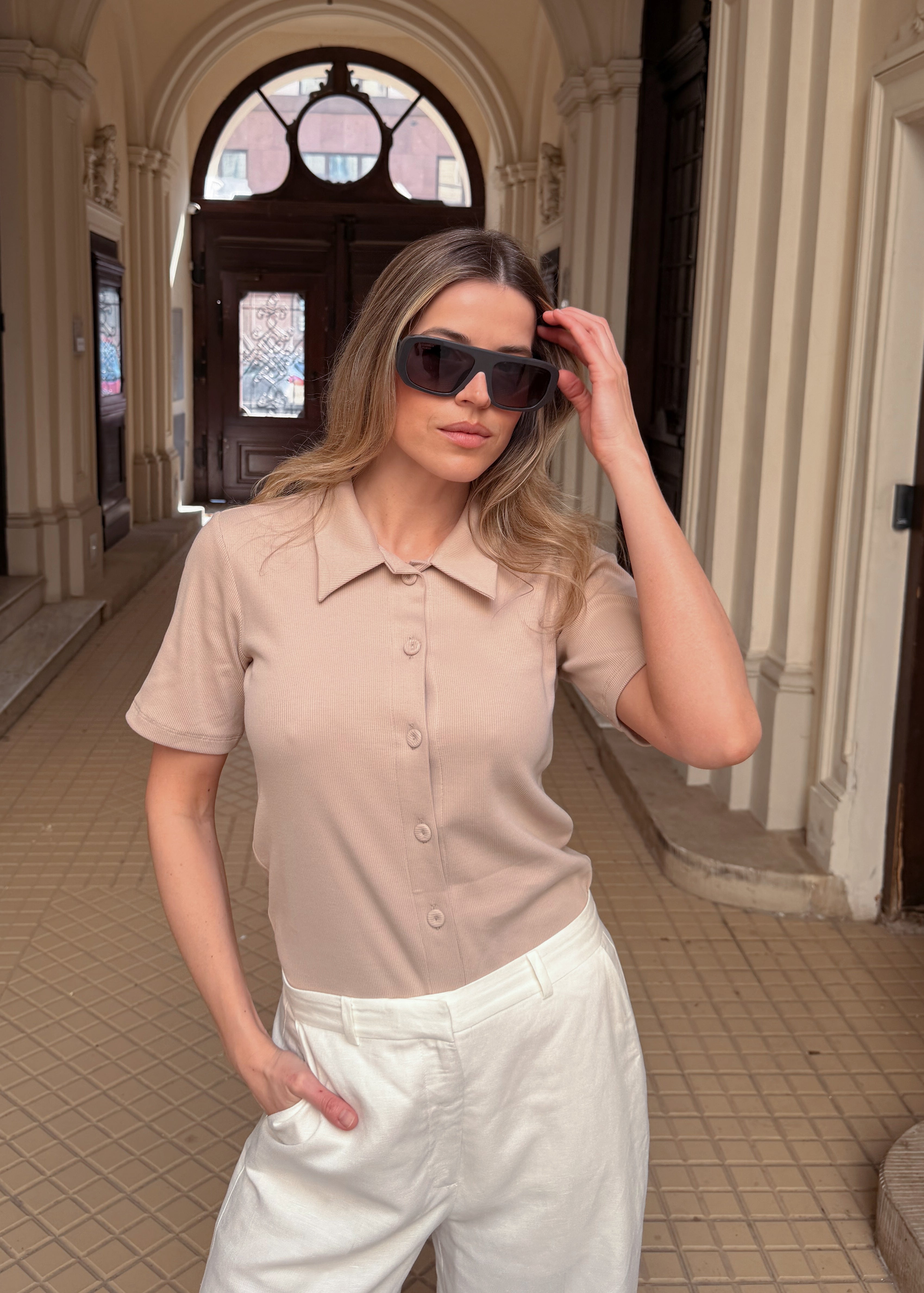 Wykonany z miękkiej, prążkowanej bawełny, zapewnia komfort noszenia i przyjemne otulenie. Guziki pokryte dzianiną w kolorze bluzki stanowią dyskretny, ale starannie dopracowany detal, który podkreśla minimalistyczny charakter modelu. To model, który odnajduje się zarówno w codziennych, jak i bardziej eleganckich stylizacjach - subtelny, ale z charakterem.