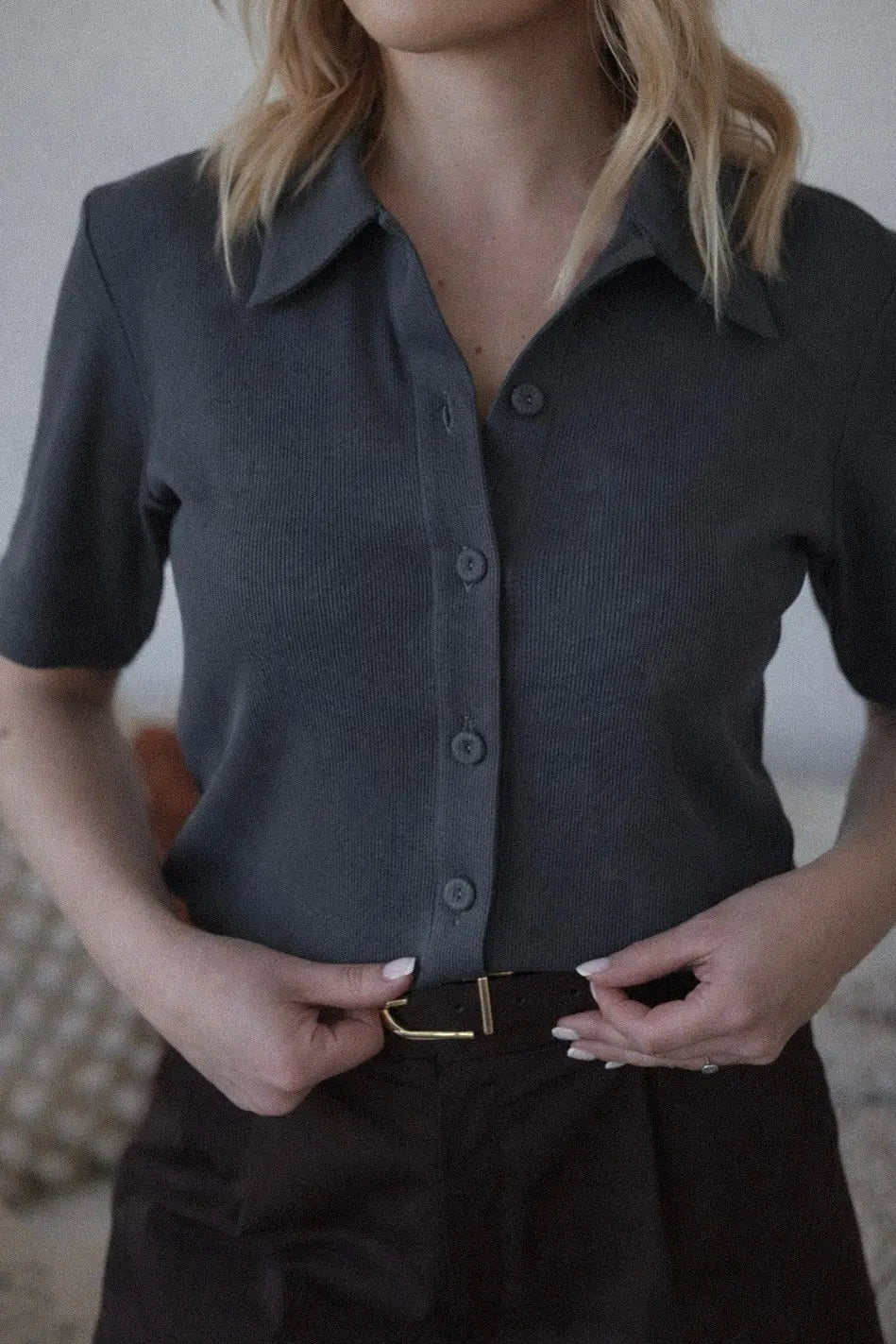 Wykonany z miękkiej, prążkowanej bawełny, zapewnia komfort noszenia i przyjemne otulenie. Guziki pokryte dzianiną w kolorze bluzki stanowią dyskretny, ale starannie zaprojektowany detal, który dopełnia minimalistyczną całość. To model, który odnajduje się zarówno w codziennych, jak i bardziej wyrafinowanych stylizacjach – subtelny, ale z charakterem.
