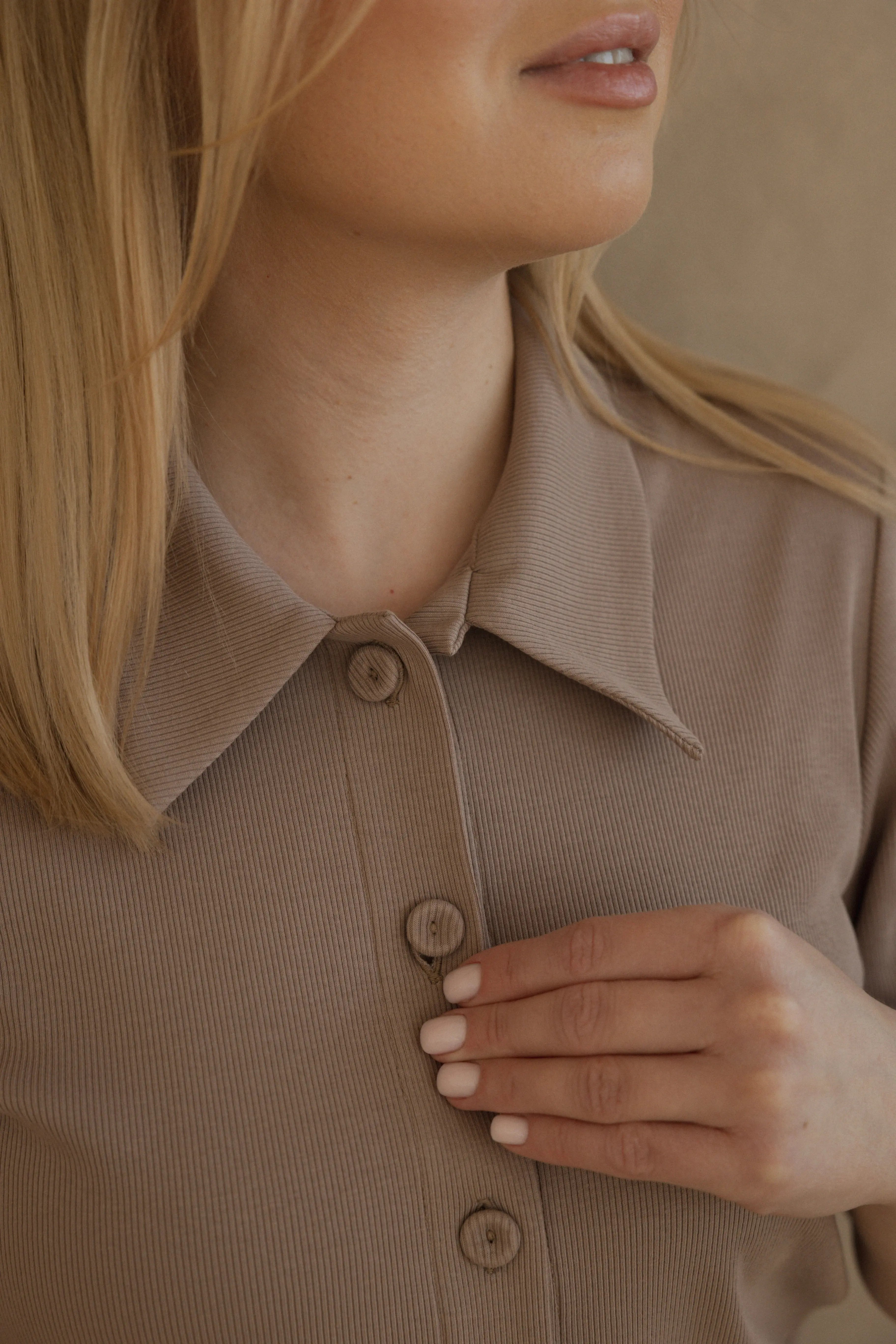 T-shirt No. 2 to kwintesencja subtelnej elegancji i wygody. Wykonany z miękkiej, naturalnej bawełny, doskonale układa się na sylwetce i zapewnia pełną swobodę ruchów. Jego ciepły, kawowy odcień mokki to jeden z najbardziej ponadczasowych kolorów, który doskonale komponuje się zarówno z neutralnymi, jak i wyrazistymi barwami. Pokryte dzianiną guziki dodają mu wyjątkowego charakteru i podkreślają minimalistyczny, ale wyrafinowany styl.