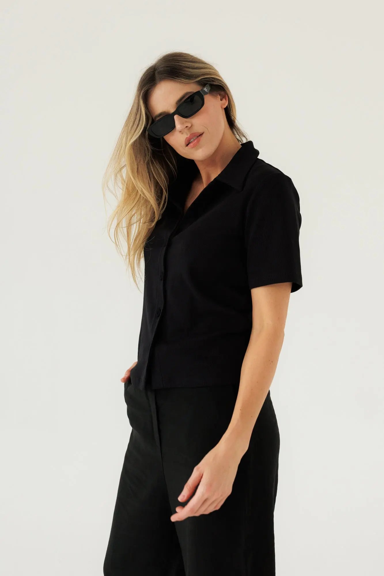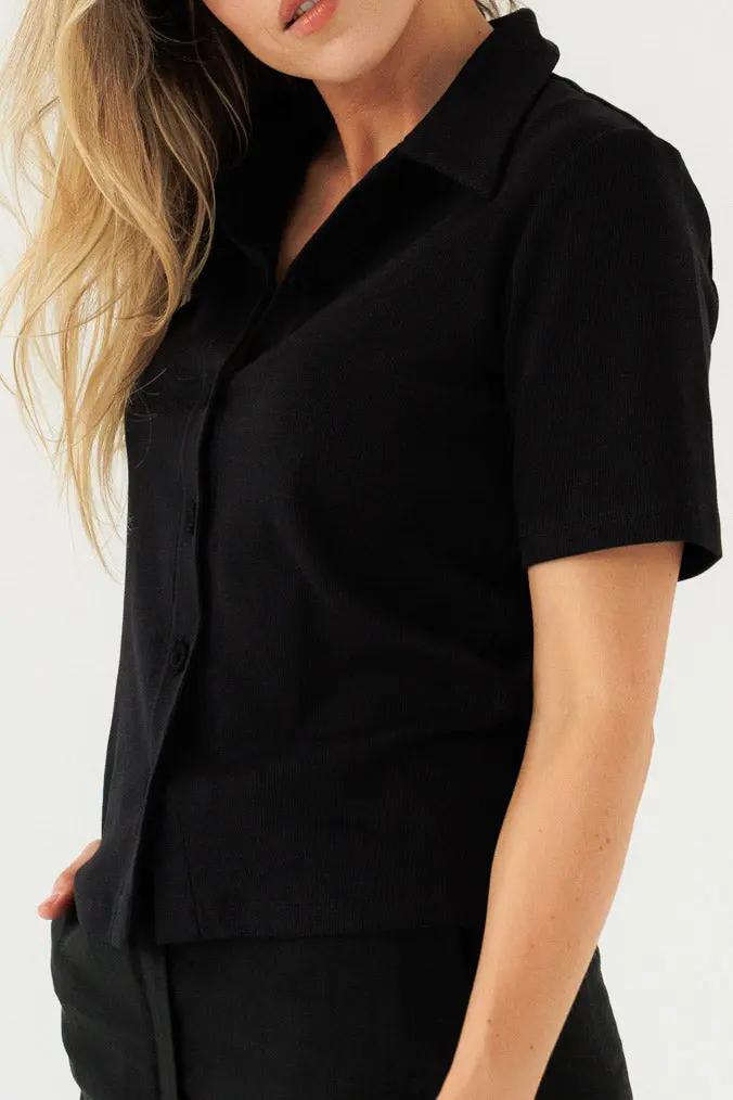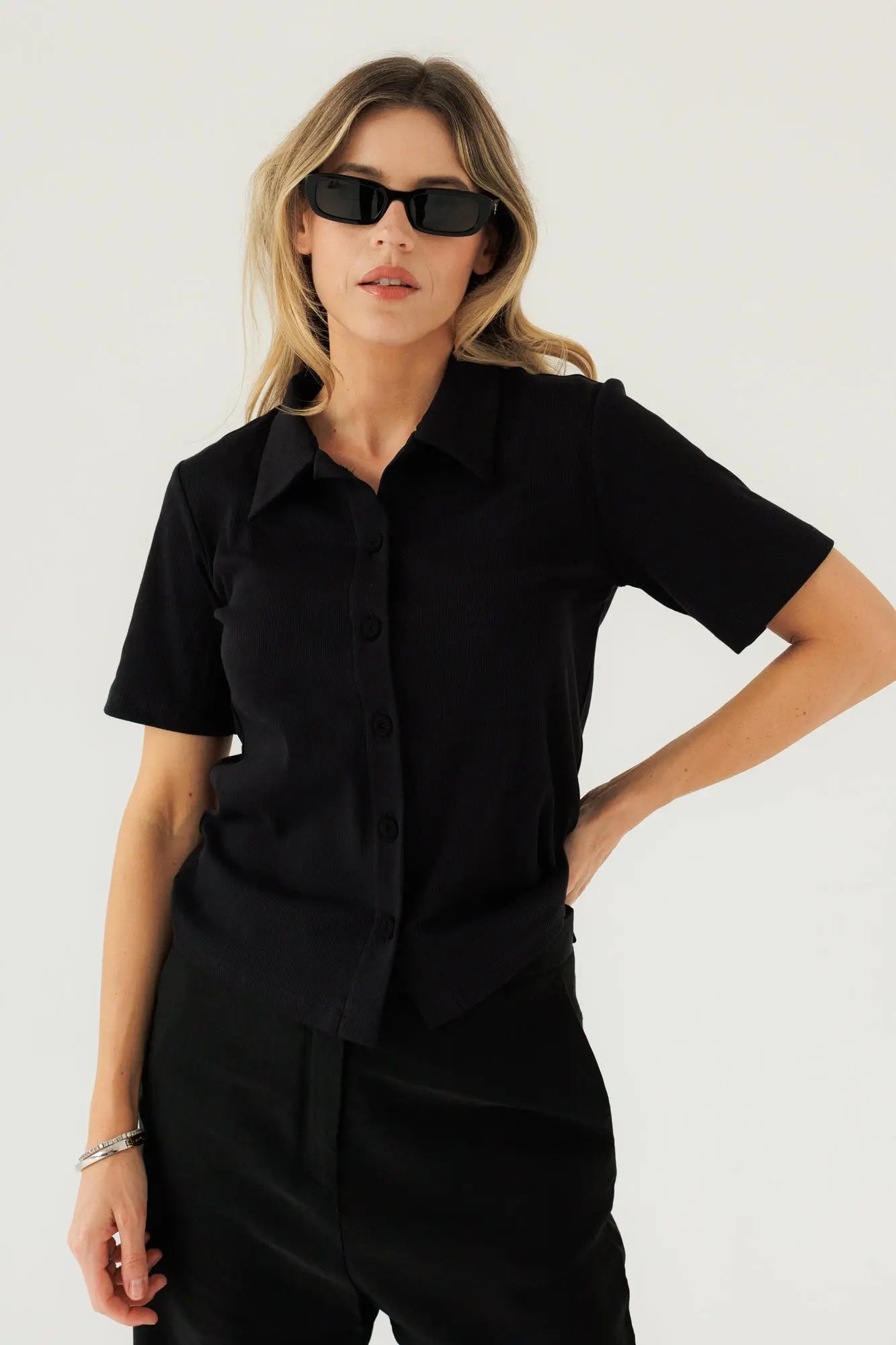 Wykonany z wysokiej jakości prążkowanej bawełny, zapewnia miękkość, trwałość i subtelną strukturę materiału. Guziki pokryte dzianiną w kolorze bluzki są wyrafinowanym detalem, który dodaje całości harmonii i spójności. To model, który doskonale odnajduje się zarówno w codziennych, jak i bardziej wyrafinowanych stylizacjach – jako baza, która buduje styl.
