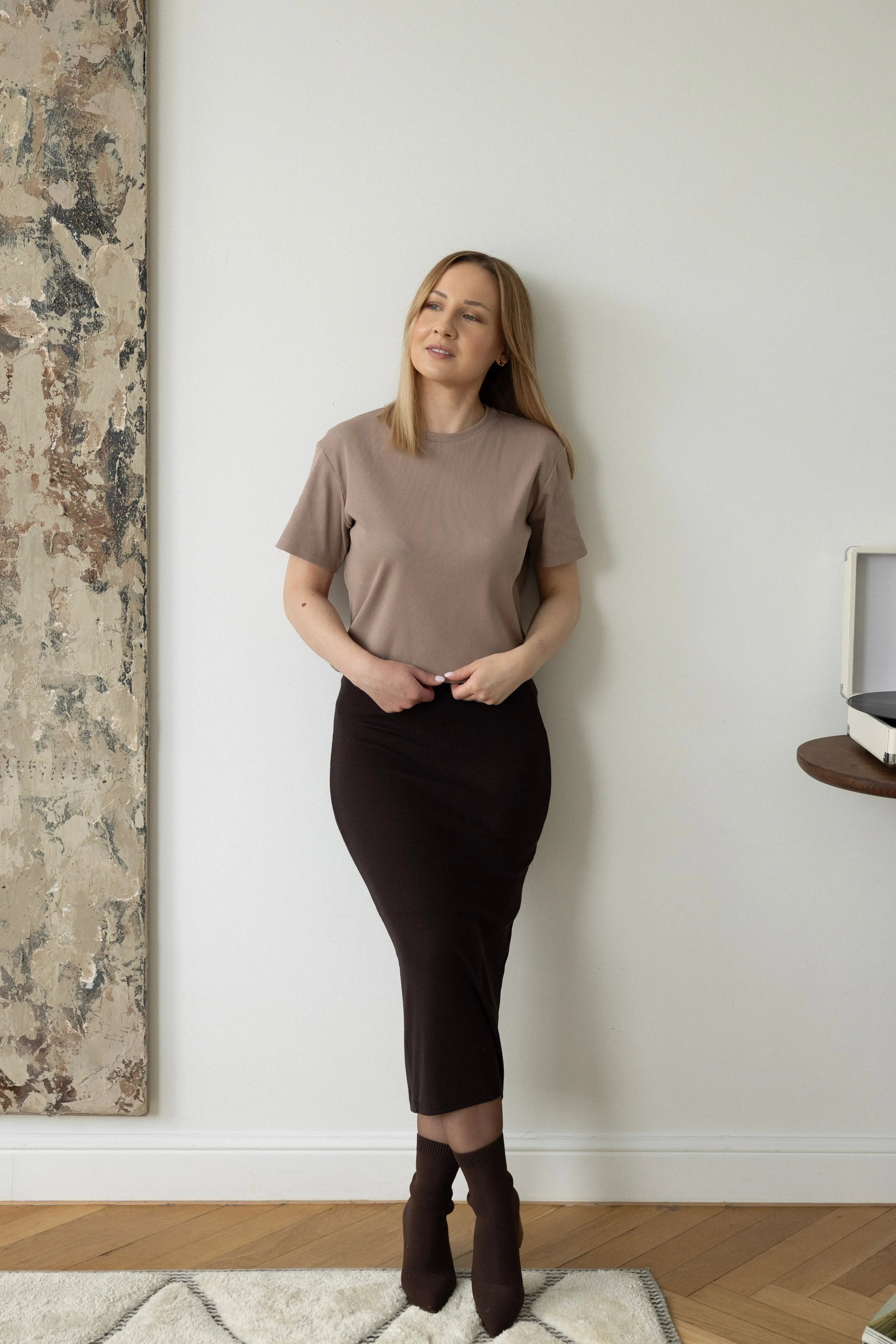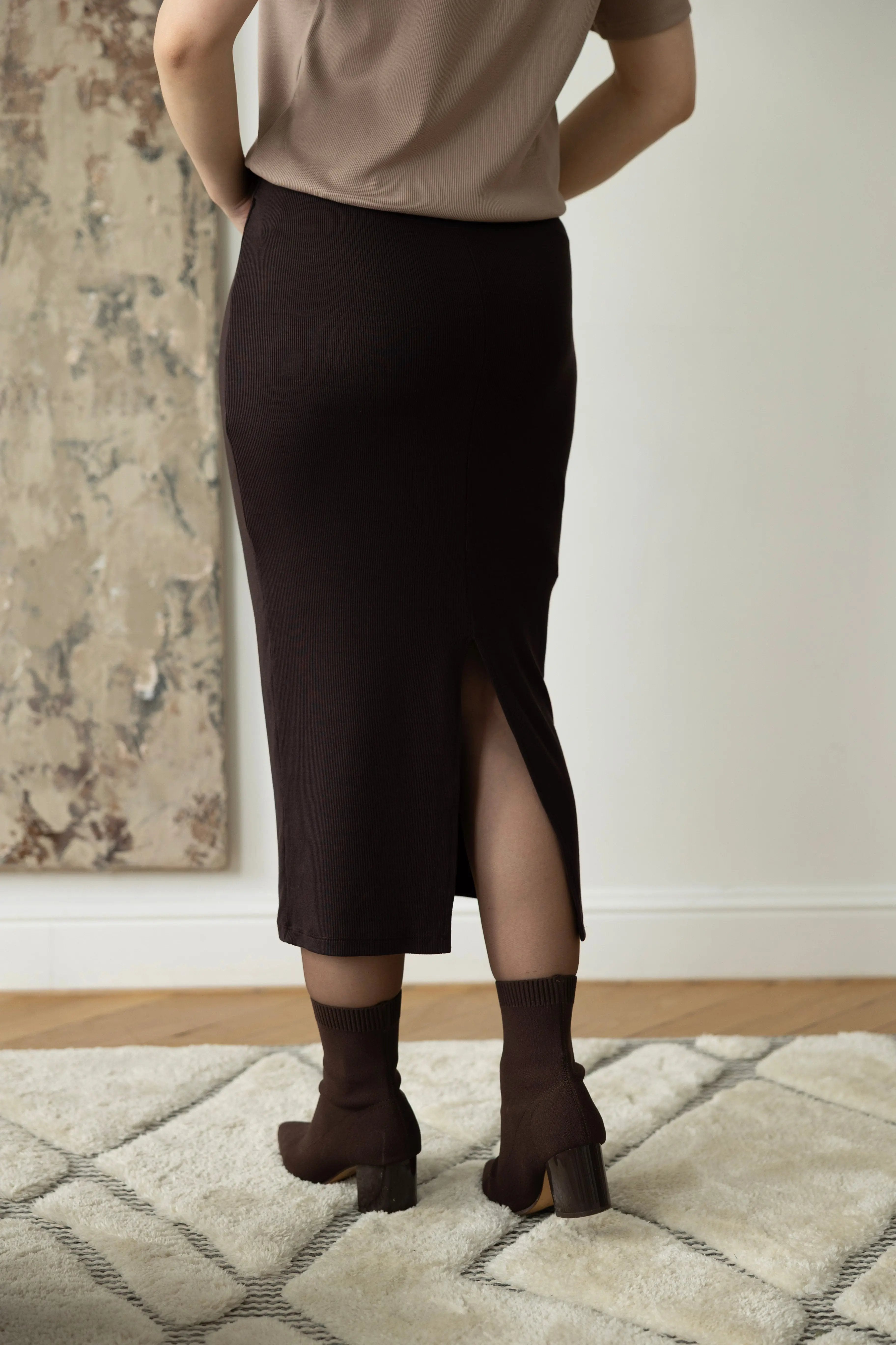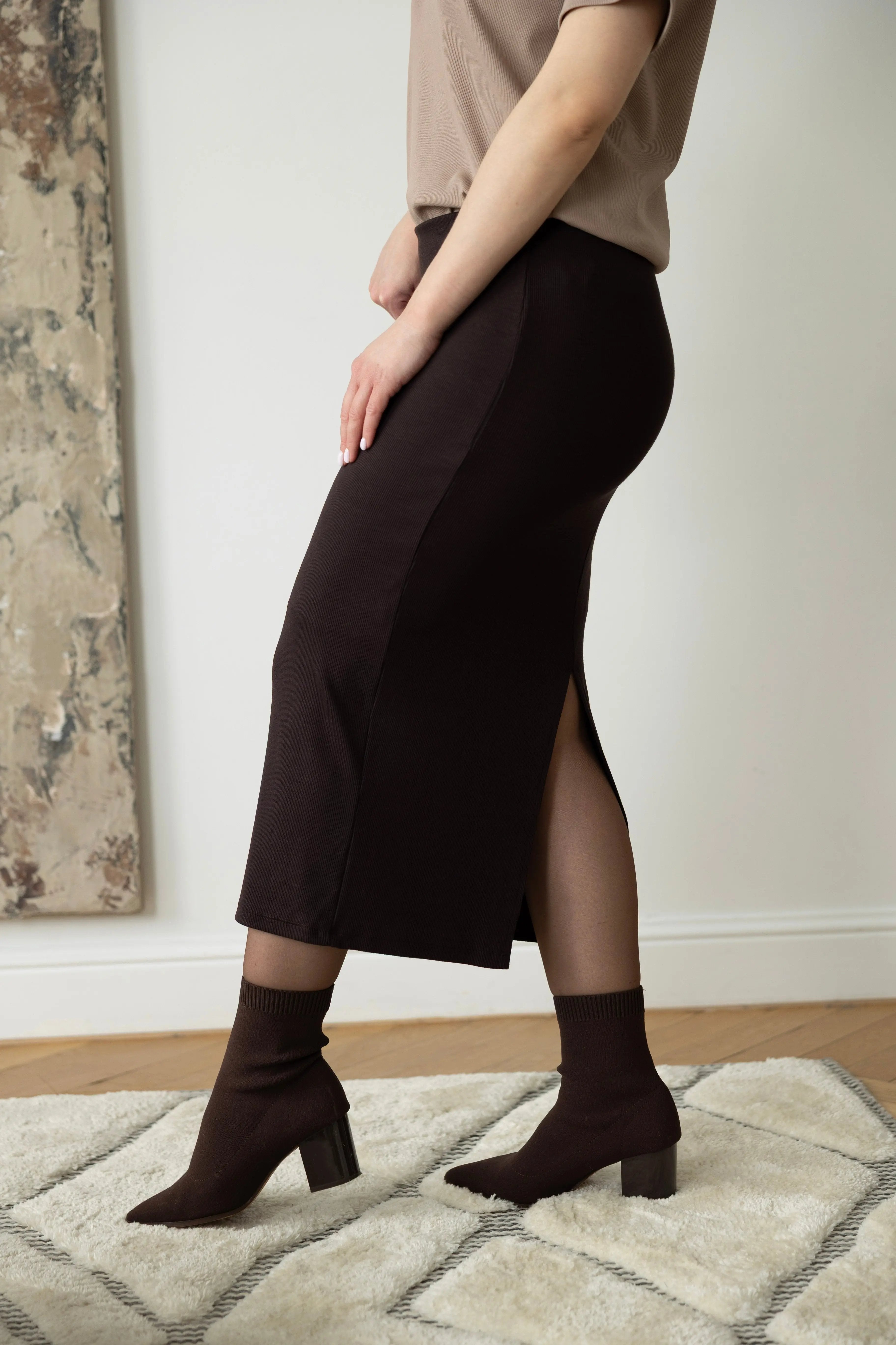 Elegancka spódnica midi w odcieniu głębokiej czekolady, która zachwyca uniwersalnym charakterem i przemyślanym designem. Wyjątkowe rozcięcie można nosić zarówno z przodu, jak i z tyłu, co pozwala na dowolne dopasowanie do Twojego stylu i okazji. Dodatkowy komfort zapewnia druga warstwa materiału, sięgająca do wysokości rozcięcia, dzięki czemu spódnica łączy w sobie estetykę i funkcjonalność. Idealna na każdą porę roku – od codziennych stylizacji po bardziej eleganckie wyjścia.