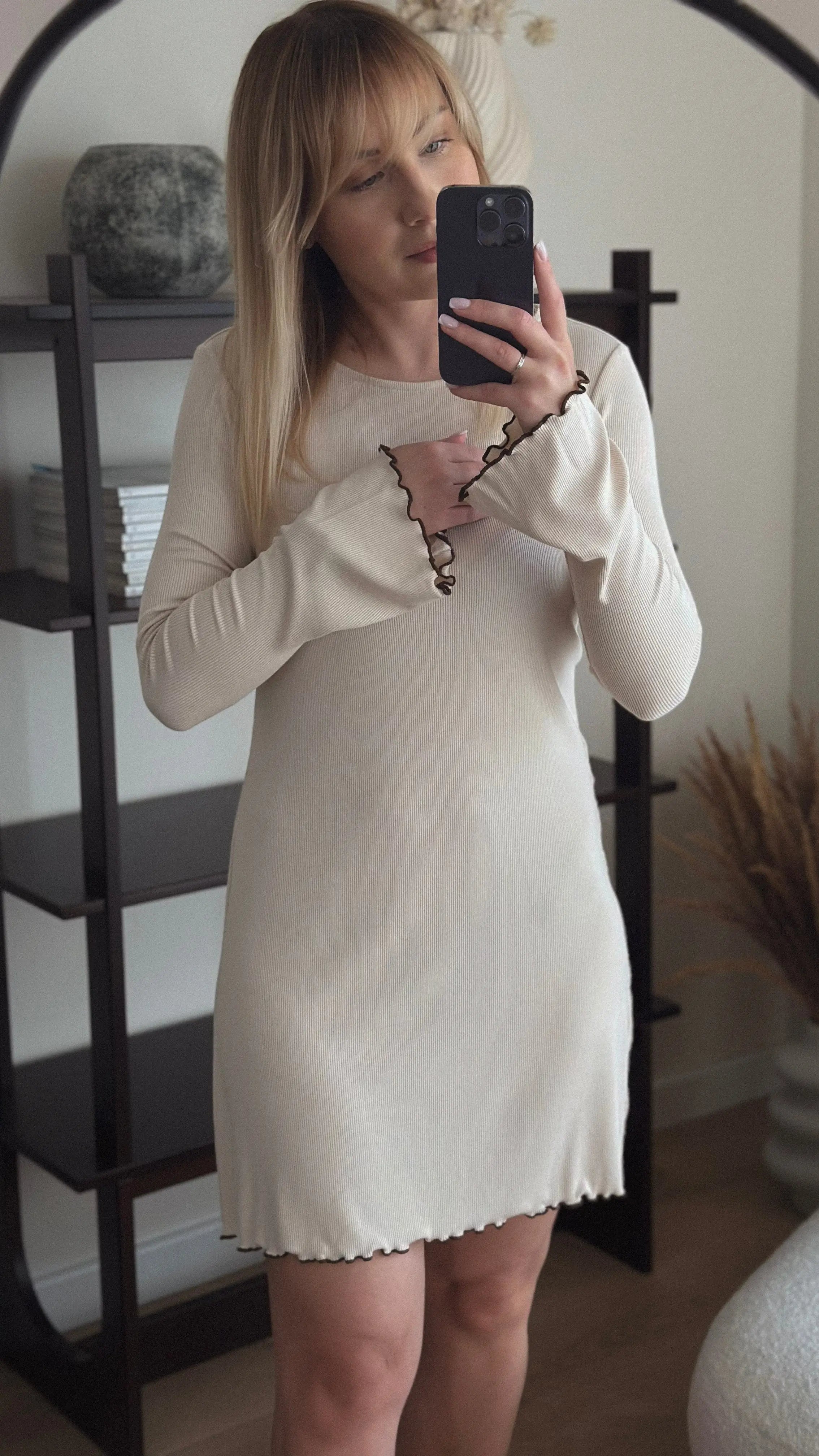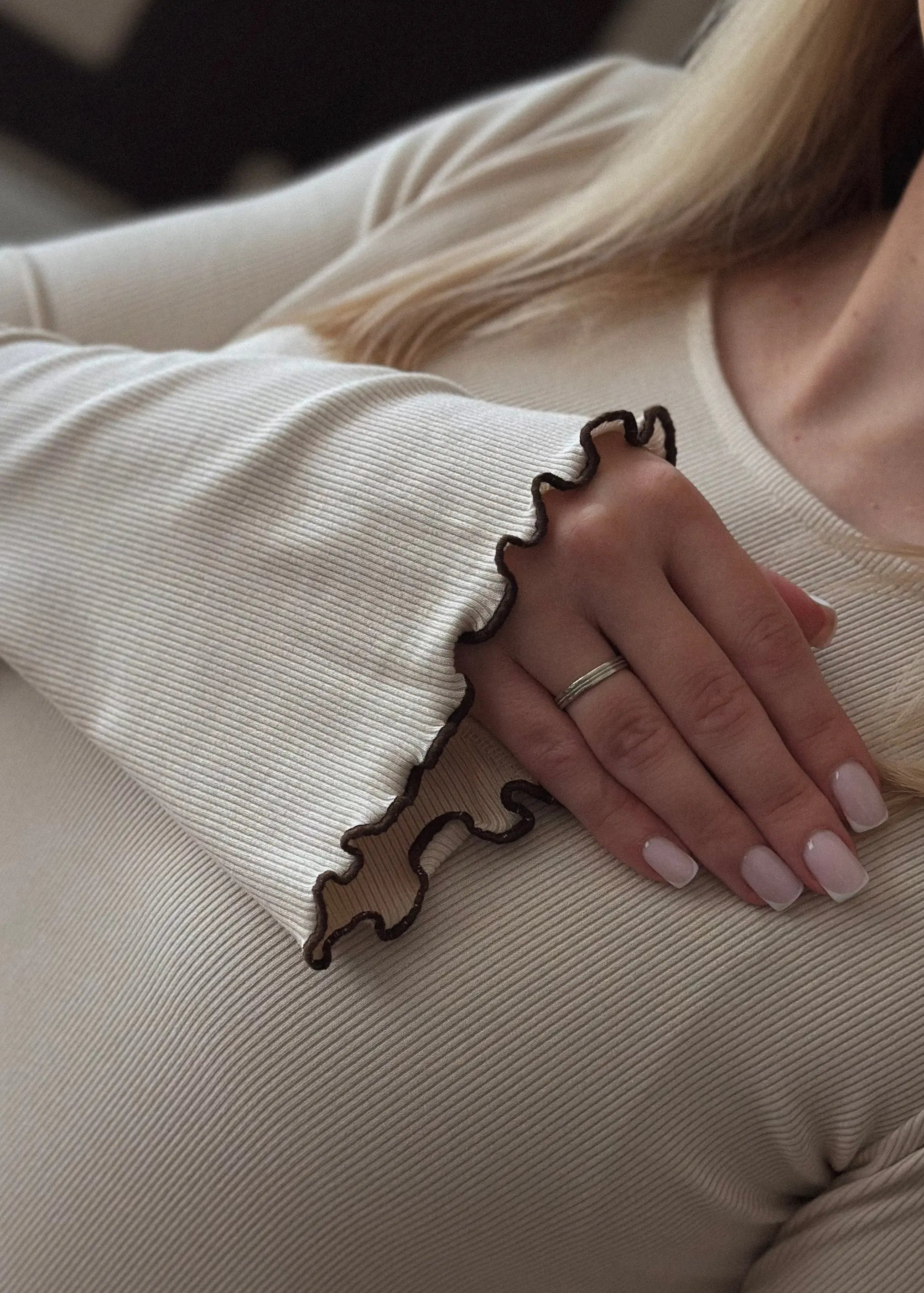 Wyjątkowa sukienka w delikatnym waniliowym odcieniu, która łączy subtelność i elegancję z codziennym komfortem. Jej lekko rozkloszowany fason w kształcie litery A nadaje sylwetce swobody i lekkości, a rozkloszowane rękawy delikatnie współgrają z każdym ruchem. Wykonana z miękkiej, prążkowanej dzianiny, otula ciało jak najdelikatniejszy dotyk letniego wiatru, a wykończona mereżką w pięknym odcieniu czekoladowego brązu.