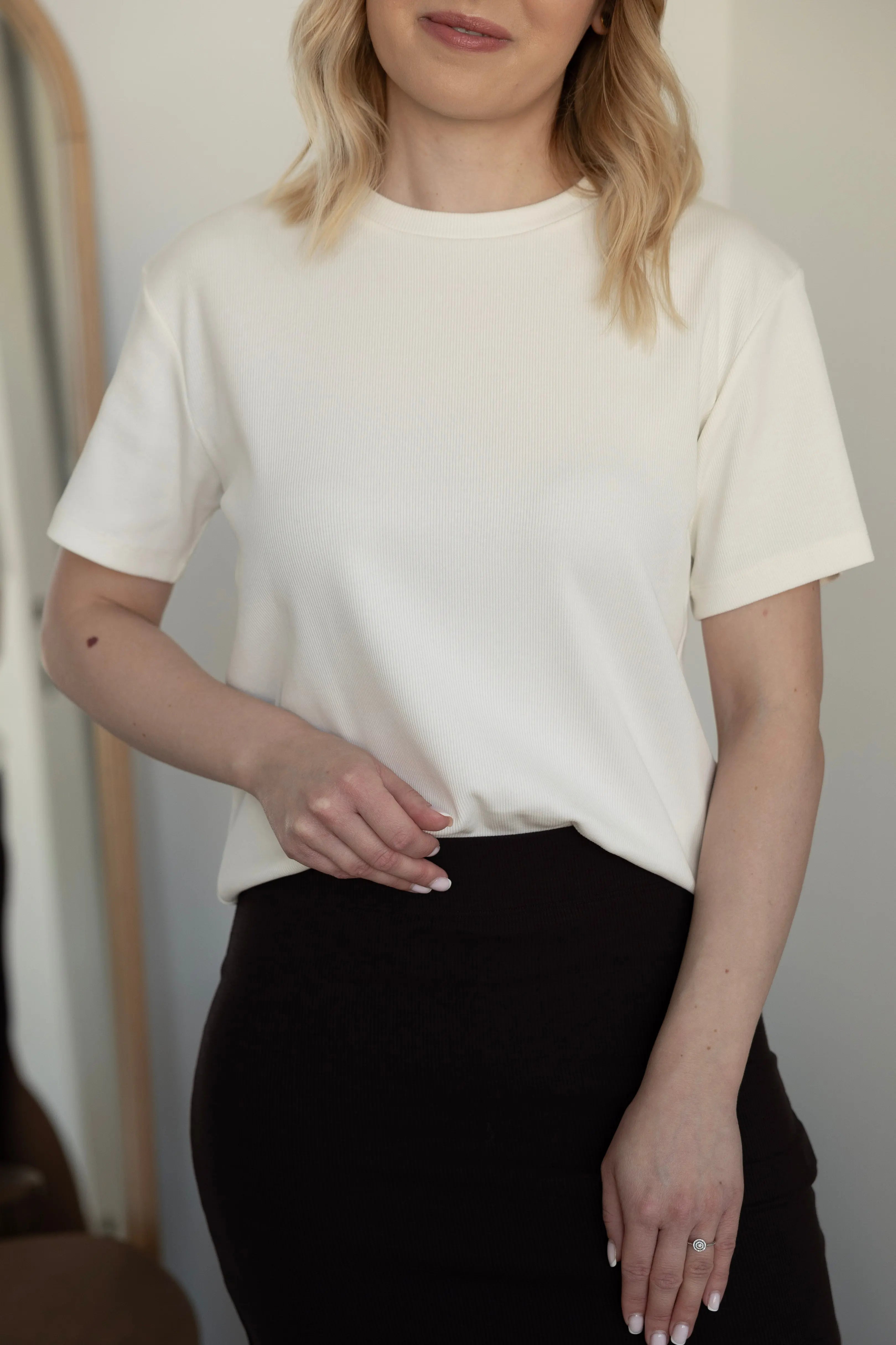 Dodaj odrobinę subtelnej elegancji do swojej garderoby dzięki naszemu T-shirtowi No. 1 Crémeux. Nazwany na cześć kremowego odcienia inspirowanego delikatnymi tonami śmietanki. Nasz T-shirt jest synonimem klasyki i naturalnego stylu. Wykonany z wysokogatunkowej bawełny z dodatkiem elastanu, zapewnia miękkość, komfort oraz idealne dopasowanie przez cały dzień, uzupełniając każdą stylizację.
