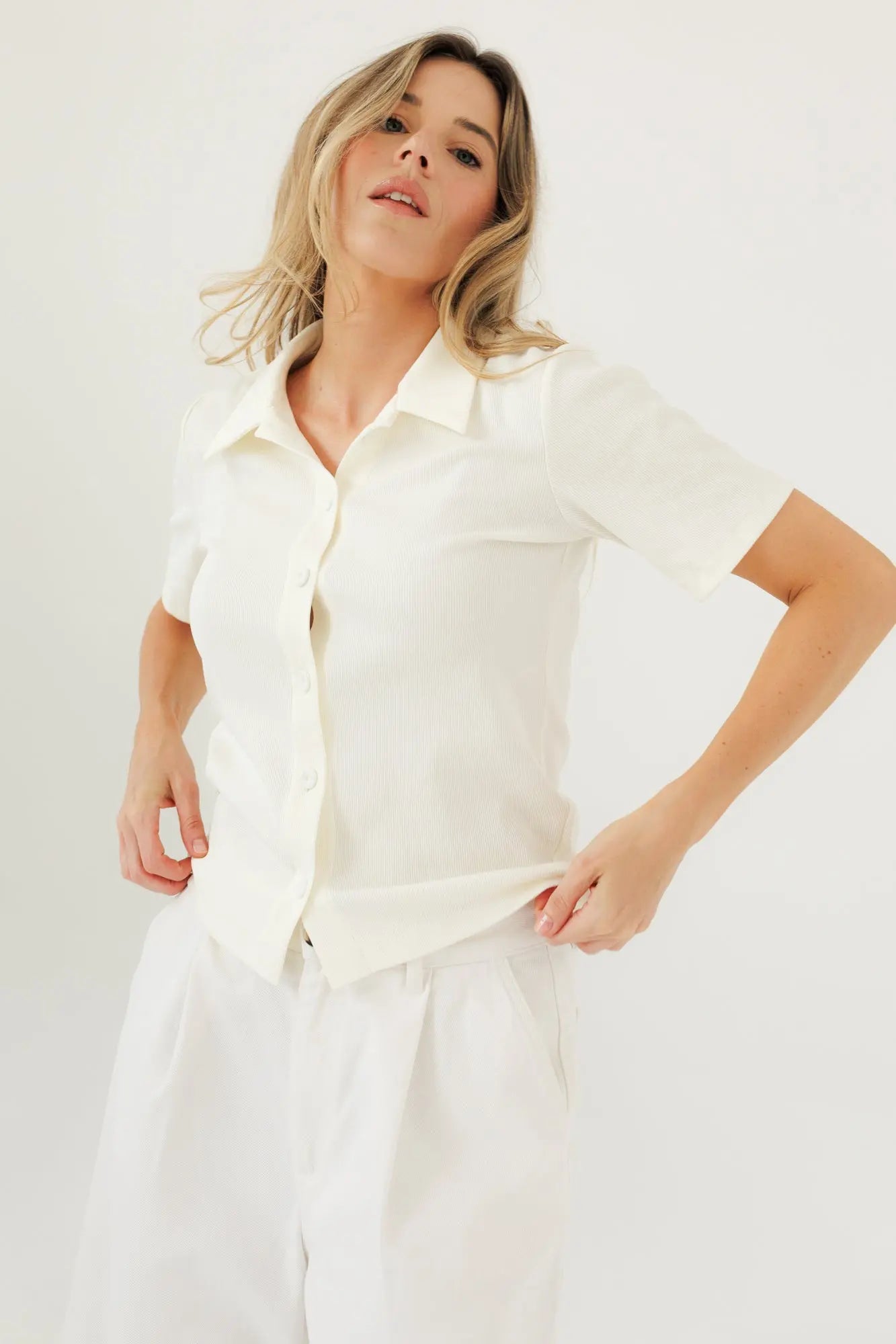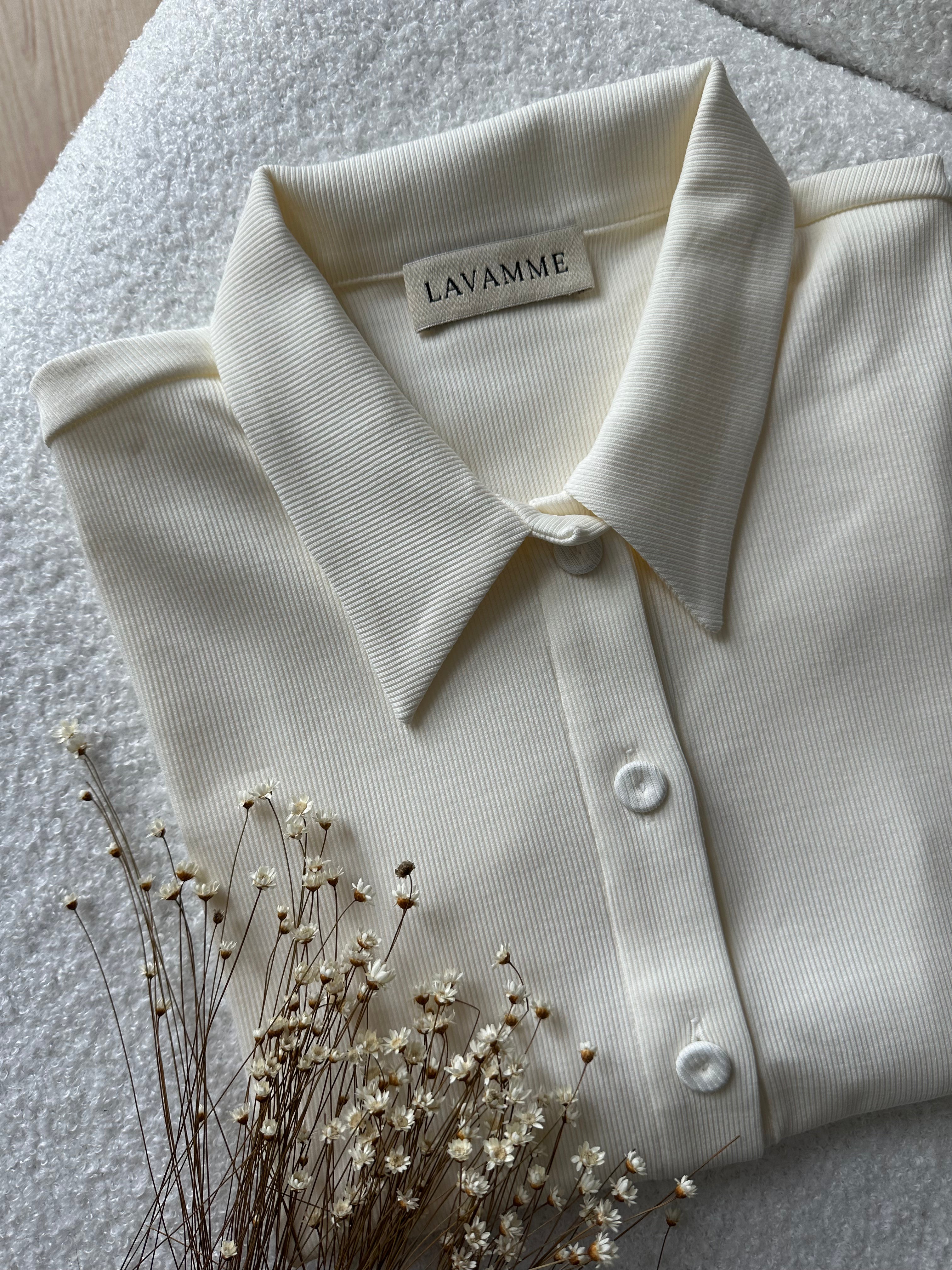 Wykonany z miękkiej, prążkowanej bawełny, zapewnia komfort noszenia i przyjemne otulenie. Guziki pokryte dzianiną w kolorze bluzki stanowią dyskretny, ale starannie zaprojektowany detal, który dopełnia minimalistyczną całość. To model, który odnajduje się zarówno w codziennych, jak i bardziej wyrafinowanych stylizacjach – subtelny, ale z charakterem.